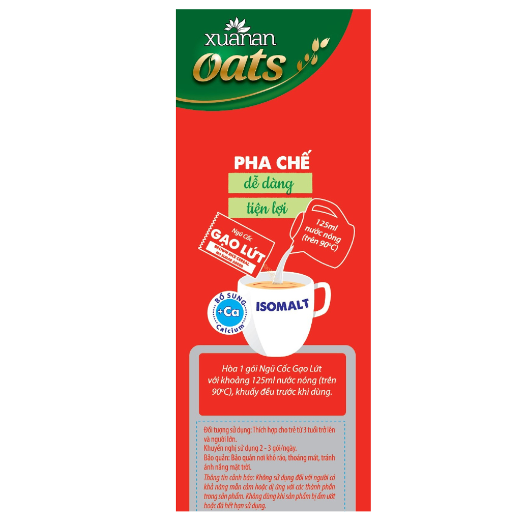 Combo Ngũ Cốc Gạo Lứt Huyết Rồng ít đường 400G(25G16 GÓI)+ N.Cốc Gạo Lứt No Sugar[đường ăn kiêng]400G(25G16 GÓI) Ngũ cốc GẠO LỨT HUYẾT RỒNG là thức uống thơm ngon bổ dưỡng, được làm từ gạo lứt, yến mạch và nhiều loại ngũ cốc. Sản phẩm được bổ sung thêm can xi và sử dụng ít đường. Vitamin, khoáng chất, chất xơ tự nhiên giúp hấp thu dinh dưỡng tốt và thanh lọc cơ thể. Thành phần: Ngũ cốc 32% (gạo lứt huyet rong 10%, yến mạch 6%, gạo lứt, gạo nếp cẩm 3%, bắp, đậu nành, lúa mỳ, lúa mạch), bột kem thực vật 29%, đường, đường ăn kiêng Isomalt, sữa tách béo 7%(Instant Skim Milk Powder &%), bột dừa, Canxi 0.7%, Muối I-ốt, maltodextrin, chất maltodextrin làm dày xanthan gum (E415), chất chống đông vón (E551), hương liệu tổng hợp dùng cho thực phẩm. 6.5 g đường trong khẩu phần 25g Ngũ cốc GẠO LỨT no Sugar là thức uống thơm ngon bổ dưỡng, được làm từ gạo lứt, yến mạch, hạt sen và rất nhiều loại ngũ cốc. Sản phẩm được bổ sung thêm can xi, sử dụng đường ăn kiêng, không sử dụng đường mía. Vitamin, khoáng chất, chất xơ tự nhiên giúp hấp thu dinh dưỡng tốt và thanh lọc cơ thể. Thành phần: Ngũ cốc 60% (bột gạo lứt 10%, yến mạch 6%, đậu đen xanh lòng 3%, nếp cẩm 3%, bắp, đậu nành, gạo, lúa mỳ, lúa mạch), hạt sen 3%, bột kem thực vật, bột dừa, sữa bột tách béo 7% (Instant skim milk powder 7%), Isomalt 3%, Canxi 0.7%, Muối I-ốt, Chất làm dày xanthan gum (E415), chất tạo ngọt (INS 951), chất chống đông vón (E551), Maltodextrin, hương liệu tổng hợp dùng cho thực phẩm. Đối tượng sử dụng: Trẻ từ 3 tuổi trở lên và người lớn. Đặc biệt là người ăn theo chế độ ăn giảm đường. Hướng dẫn sử dụng: Hòa 1 gói Ngũ cốc với khoảng 125ml nước sôi, khuấy đều trước khi dùng. Dùng 2-3 gói mỗi ngày Bảo quản: Bảo quản nơi khô ráo, thoáng mát; tránh tiếp xúc trực tiếp với không khí và ánh nắng mặt trời. Thông tin cảnh báo: Không dùng khi sản phẩm bị rách, mốc hoặc đã hết hạn sử dụng. Sản phẩm của: Công ty TNHH Thực Phẩm Dinh Dưỡng Xuân An