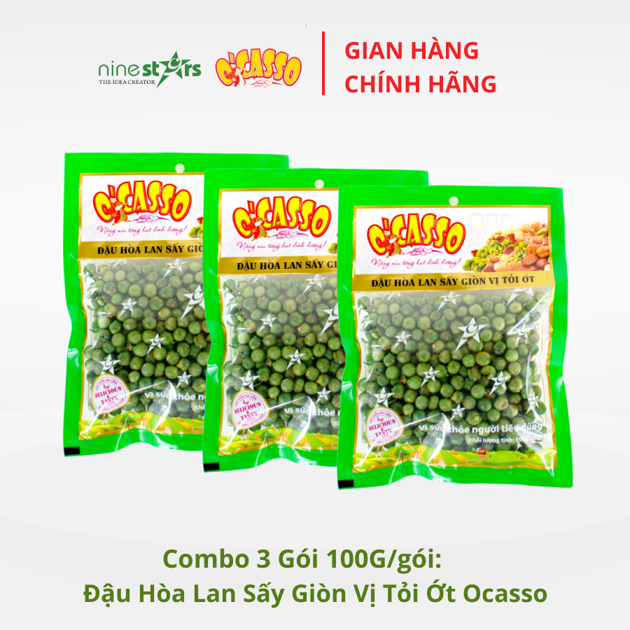 • Đậu hòa lan sấy giòn vị tỏi ớt O’Casso. Sản Phẩm chính hiệu của Nine Stars đảm bảo chất lượng, thơm ngon, giòn tan từng hạt. Một chút hương vị tỏi và độ cay nồng của ớt hòa vào độ béo ngậy của hạt đậu hòa lan cho ta cảm giác ăn ngon say mê không ngán mà nhiều dinh dưỡng.