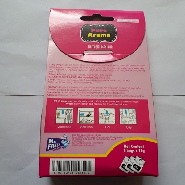 Thông Tin Sản Phẩm Tên Sản Phẩm : Hộp 3 túi thơm ngàn hoa Mr Fresh Hàn Quốc (10g/túi) Công dụng : - Giúp khử mùi ẩm mốc rất tốt ở những nơi như trong