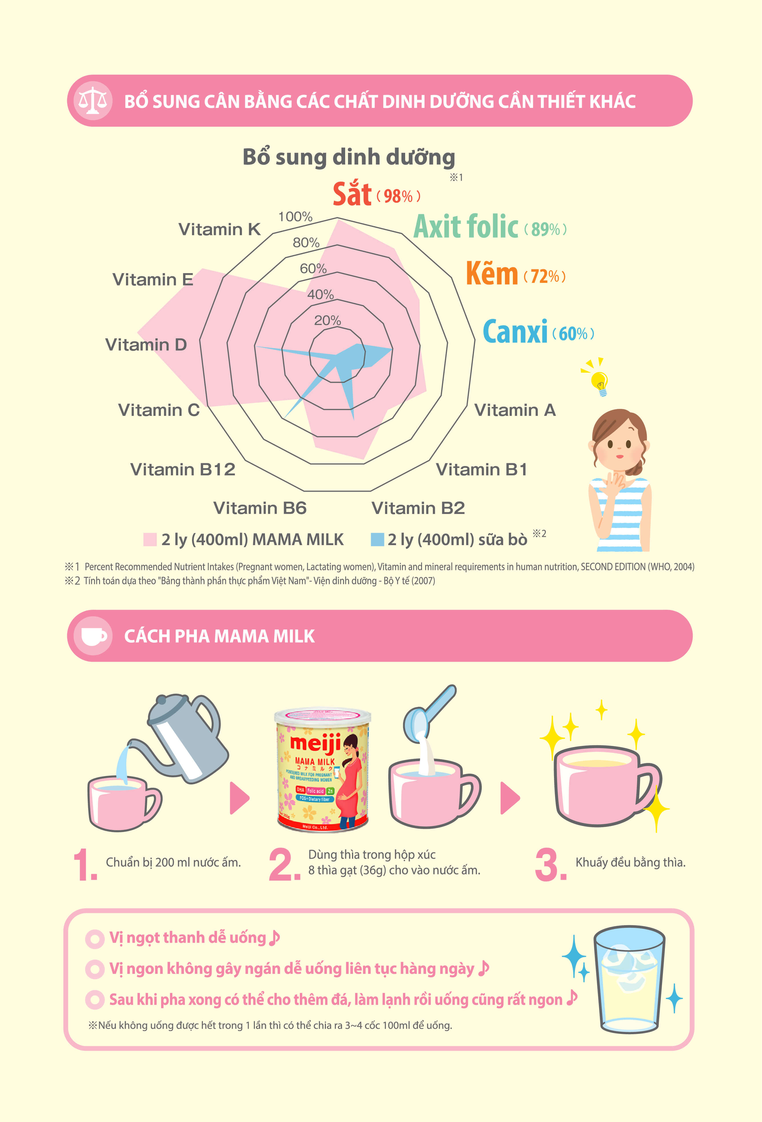 - Meiji Mama Milk hỗ trợ trên 30% lượng khuyến nghị của 13 khoáng chất và Vitamin cần thiết khi mang thai và cho con bú. theo quy định của FAO/WHO.