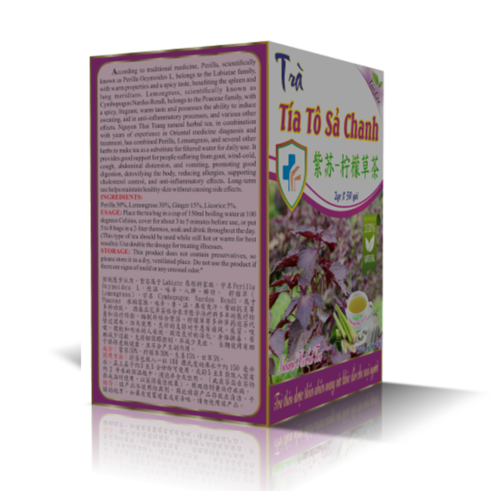 TRÀ TÍA TÔ SẢ CHANH Theo y học cổ truyền, Cây Tía Tô có tên khoa học là Perilla Ocymoides L thuộc họ Hoa môi Labiatae, có tính ấm, vị cay lợi vào kinh tỳ - Phế. Sả Chanh (Củ Sả) có tên khoa học là Cymbopogon Nardus Rendl thuộc họ Lúa Poaceae, có vị cay the, thơm, tính ấm, có tác dụng ra mồ hôi, giúp chống viêm ..vv. Trà Thảo Dược Nguyên Thái Trang kết hợp cùng Phòng Chuẩn Trị Đông Y với nhiều năm kinh nghiệm trong việc khám và chữa bệnh đã đúc kết và phối hợp Cây Tía Tô, Sả Chanh cùng một số loại thảo mộc khác để làm trà thay nước lọc dùng trong ngày, Tăng Sức Đề Kháng, Giải nhiệt cơ thể, hỗ trợ tốt cho người bị Gout, Phong hàn, cảm ho, đầy bụng ói mửa, thúc đẩy tiêu hoá tốt,  giúp giảm dị ứng, hỗ trợ kiểm soát Cholesterol, tiêu viêm. Dùng lâu giúp cho làn da khỏe mạnh mà không gây tác dụng phụ. THÀNH PHẦN: Cây Tía Tô 50%, Sả Chanh 30%, Gừng 15%, Cam Thảo 5%. CÁCH DÙNG: Cho túi trà vào tách nước sôi 100oC đậy kín khoảng 3-4 phút là dùng được. Ngày uống từ 4 đến 6 gói có thể cho trực tiếp vào bình thủy uống trong ngày  ( loại trà này nên dùng khi nước trà còn nóng hoặc ấm thì tốt hơn).  BẢO QUẢN: Vì không sử dụng hóa chất bảo quản nên để hộp trà nơi khô ráo, thoáng sạch. HẠN SỬ DỤNG: