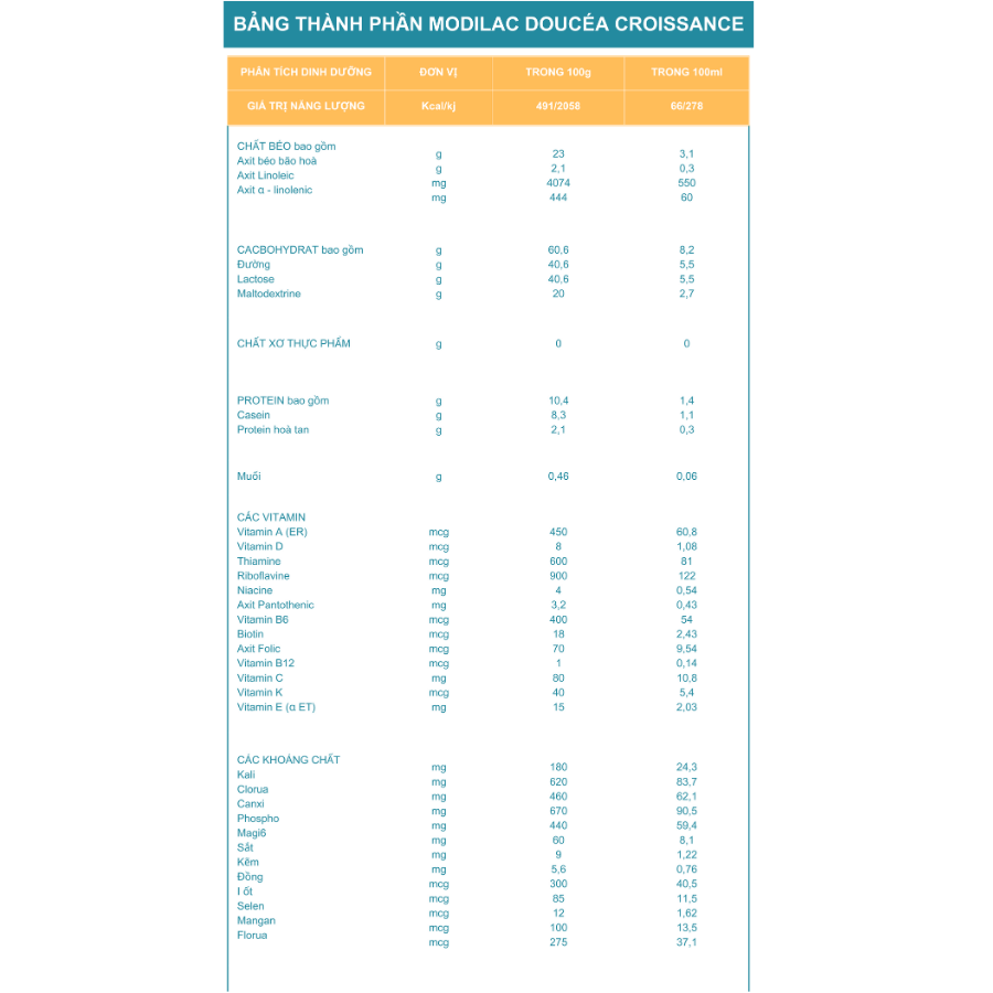 Sữa mẹ là thức ăn tốt nhất cho sức khỏe và sự phát triển toàn diện của trẻ sơ sinh và trẻ nhỏ.   Sữa bột cao cấp Modilac Doucéa Croissance dành cho trẻ từ 12-36 tháng tuổi được nhập khẩu nguyên hộp từ Pháp   MODILAC SỮA NỘI ĐỊA PHÁP - 9 ĐIỂM VÀNG CHẤT LƯỢNG CHO BÉ!   • Modilac cực kì dễ uống với vị sữa thanh nhạt, mùi thơm nhẹ, bé dễ dàng thích nghi khi chuyển từ sữa mẹ qua sữa công thức, hay đổi từ sữa công thức này qua sữa công thức khác • Sữa giúp bé tăng cân, tăng đề kháng, tăng ghi nhớ nhờ các dưỡng chất đắt đỏ: Lactoferrin, Bifidobacterium, Protein, DHA/ARA... • Sữa giúp bé giảm biếng ăn, giảm ốm vặt, giảm trằn trọc khó ngủ nhờ hệ dưỡng chất toàn diện, cung cấp năng lượng theo nhu cầu của cơ thể phù hợp với lứa tuổi   6 YÊN TÂM KHI MẸ CHỌN MODILAC SỮA NỘI ĐỊA PHÁP  • Modilac là dòng sữa nội địa cao cấp tại Pháp. • Là một trong ít nhãn sữa có viện nghiên cứu riêng. • Mỗi lon sữa Modilac Doucéa đều trải qua hơn 40 năm cải tiến không ngừng, phù hợp với sự phát triển của bé. • Trải qua hơn 800 lần xét nghiệm, hơn 200 lượt kiểm tra trước khi đưa ra thị trường. • Là dòng sữa công thức sản xuất bởi tập đoàn Savencia với hơn 60 xây dựng và phát triển. • Tại Việt Nam, Modilac Doucéa được phân phối bởi tập đoàn DETECH với lịch sử phát triển hơn 30 năm cùng đội ngũ nhân sự hàng nghìn người!   HƯỚNG DẪN SỬ DỤNG Lưu ý: Xuất xứ: Pháp Hạn sử dụng: 36 tháng Bảo quản sữa bột Modilac ở nơi thoáng mát, khô ráo trước và sau khi mở. Sau khi mở, đóng nắp thật chặt. Sử dụng trong vòng 1 tháng kể từ lần mở hộp đầu tiên.