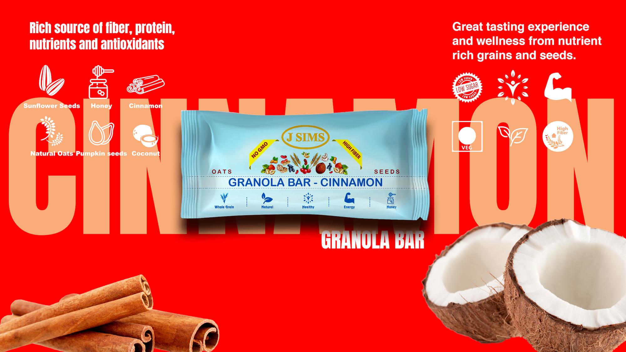 J SIMS Granola Bar Cinnamon Snack - Healthy Nutritious Convenient Snack - Just the right type of nutrition, when you have no time for a meal. - Plant based nutrition that provides energy for a hard