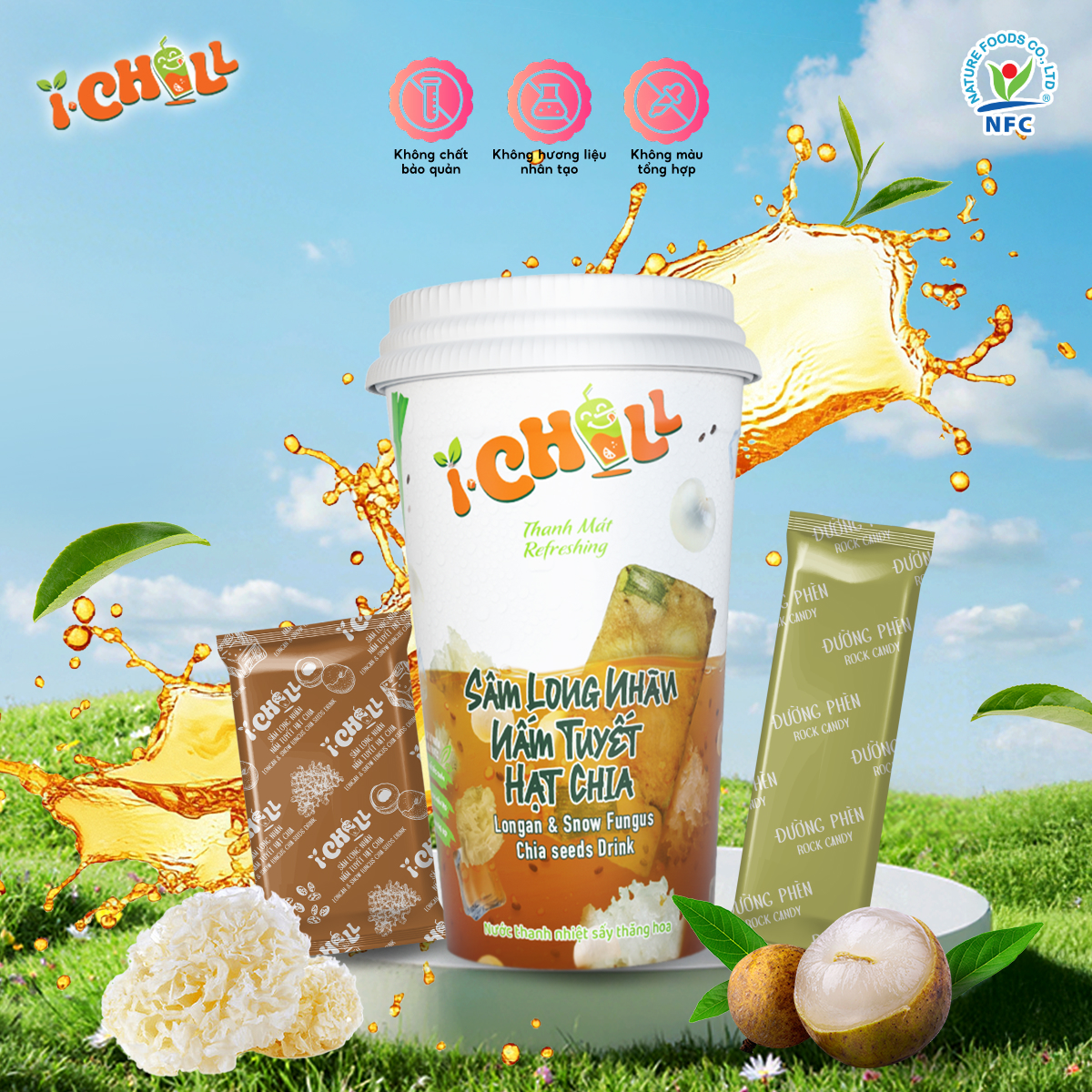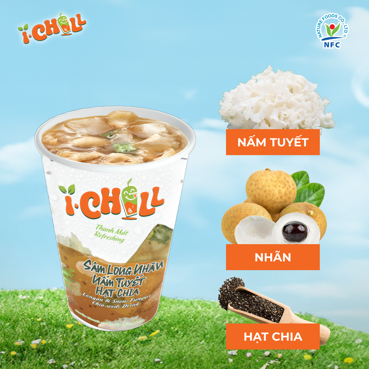 Mỗi ngụm nước ICHILL Sâm long nhãn nấm tuyết hạt chia là một trải nghiệm gu nước nhẹ nhàng. Vị ngọt thanh tự nhiên từ sâm đất và long nhãn hòa quyện cùng hương lá dứa thơm dịu, điểm thêm chút giòn mát từ nấm tuyết và hạt chia tốt cho tiêu hóa.