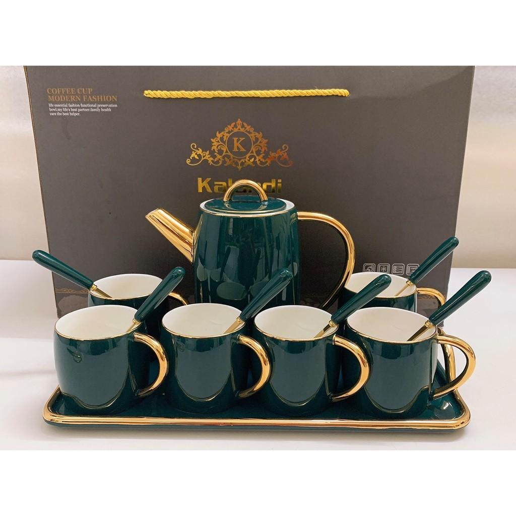Bộ ấm chén sứ, bộ tách pha trà cà phê cao cấp màu xanh cổ vịt họa tiết hươu vàng