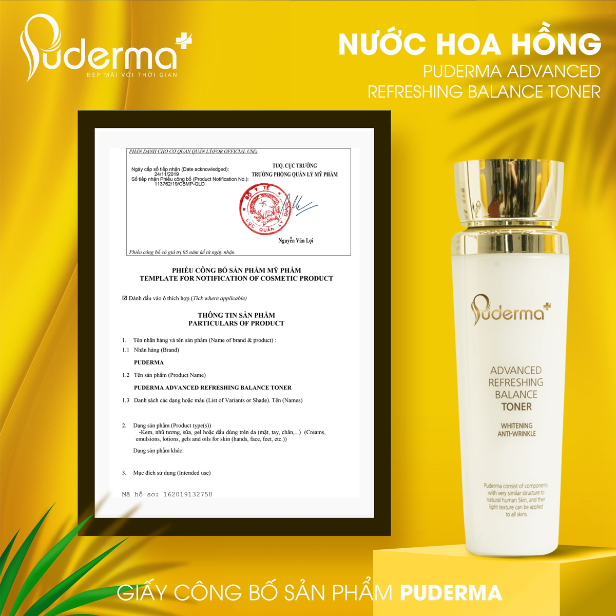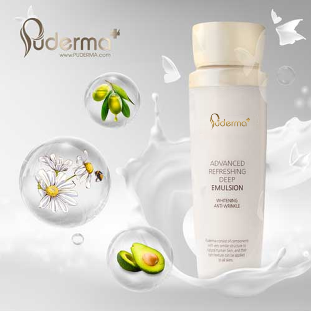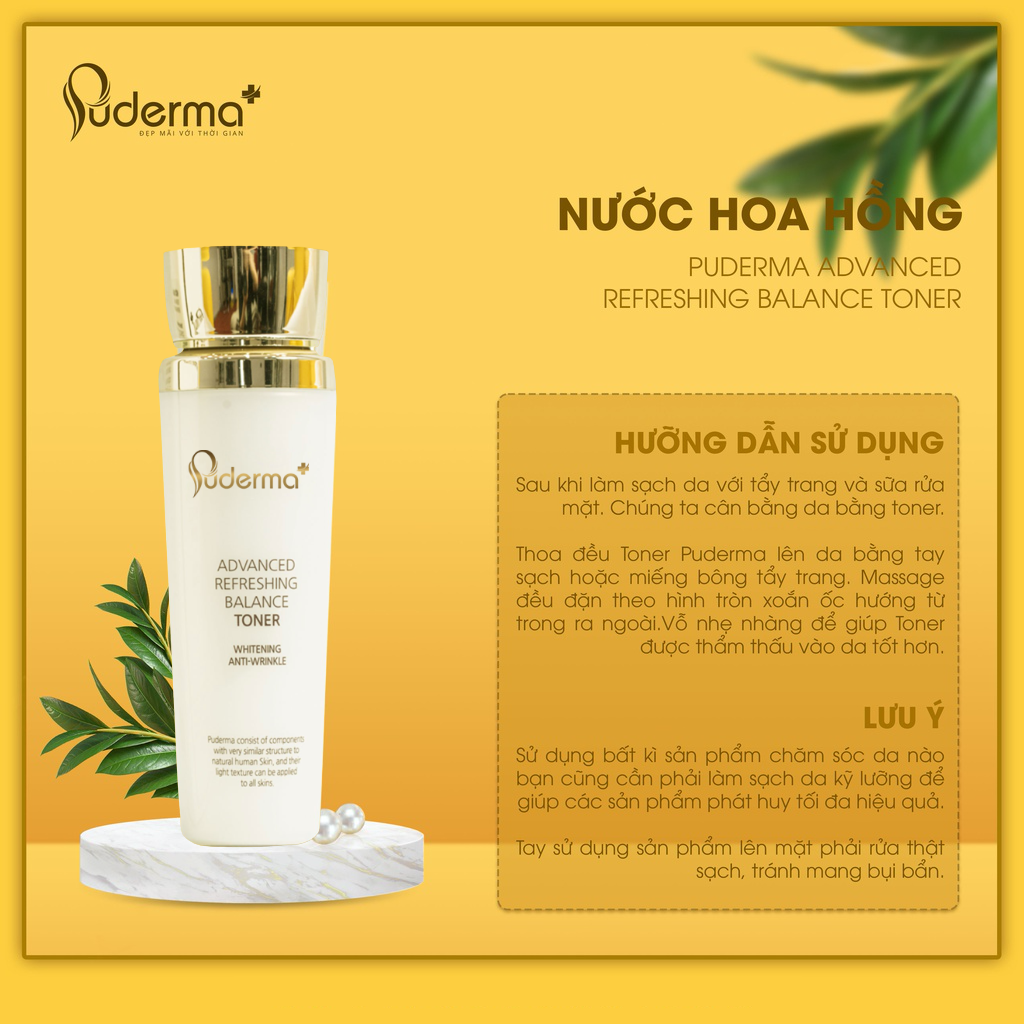 - Chiết xuất từ thảo dược thiên nhiên. . ́ ̛̛́ ̛̛̃ ́ ́, ̉ ̛́ B1: Tẩy trang với Puderma Skin Balancing Control Cleansing Water ngay cả khi không make up. B2: Rửa sạch mặt với sữa rửa mặt sạch sâu và không khô da Puderma Advanced Refreshing Cleansing Foam. B3: Tẩy da chết bằng Puderma Advanced Refreshing peeling gel khoảng từ 1-2 lần/1 tuần. B4: Nước hoa hồng Puderma Advanced Refreshing Balance Toner làm sạch sâu và cân bằng độ PH cho da. B5: Puderma Advanced Refreshing Intensive serum Sữa dưỡng Puderma Advanced Refreshing Deep Emulsion Kem dưỡng ngày Puderma Anti Pollution Brightening Day Cream/ Puderma Anti Wrinkle Repairing Night. B6: Kem chống nắng Puderma UVExpert Aqua Sun Cream Cam kết: