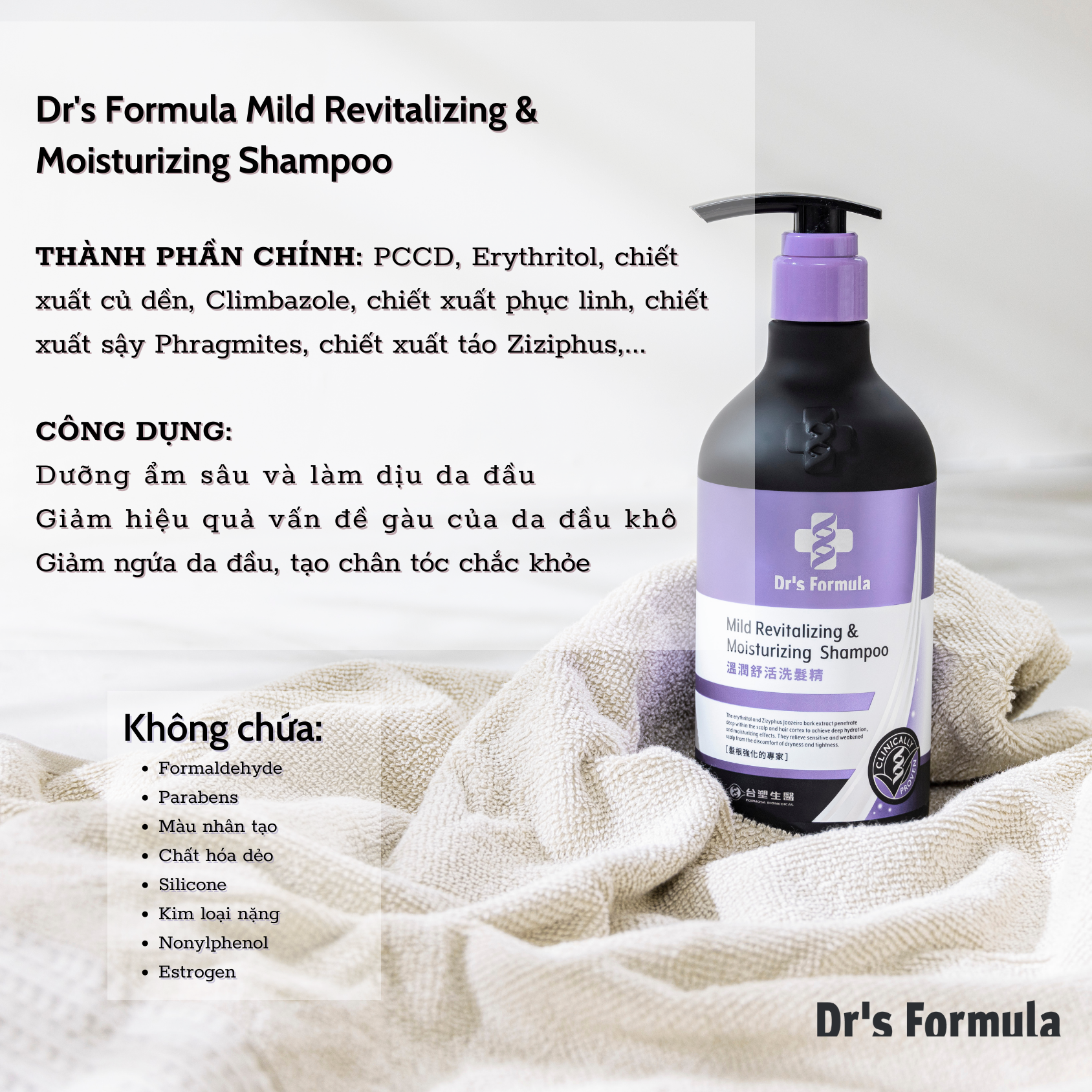 SẢN PHẨM CHÍNH HÃNG 100% NHẬP KHẨU TRỰC TIẾP TỪ ĐÀI LOAN COMBO BAO GỒM: -01 Dầu Gội Phục Hồi Và Dưỡng Ẩm Dr's Formula Mild Revitalizing & Moisturizing Shampoo 580g -01 Dầu Xả Dưỡng