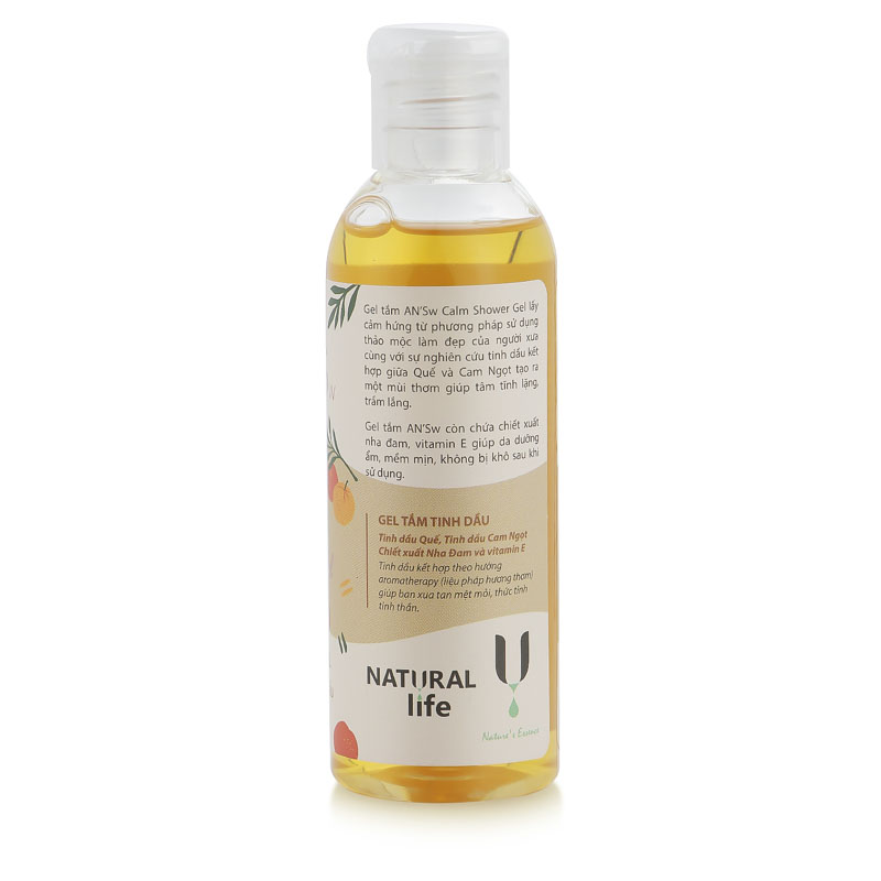 - Calm (Tinh Dầu Quế + Cam Ngọt): tạo mùi hương trầm lắng, ngọt dịu thấm đẫm không gian. Gel tắm với sự kết hợp giữa tinh dầu và các tinh chất nha đam, vitamin E, Glycerin, giúp da được dưỡng ẩm và bổ sung khoáng chất. Cho bạn làn da khỏe mạnh, mịn màng và trắng sáng. Sản phẩm được làm từ thiên nhiên nên rất an toàn cho da. Không chứa các chất độc hại. Phù hợp với mọi loại da. Công dụng của sữa tắm AN’Sw