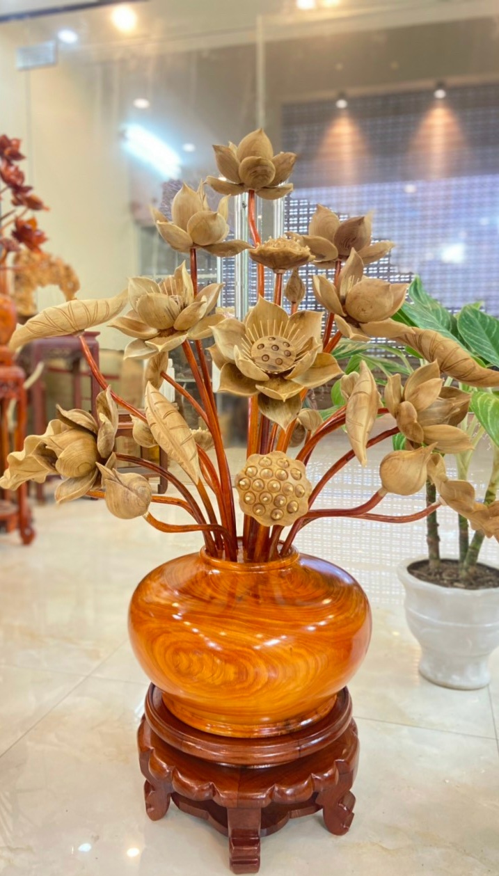 _ Bình hoa sen trang trí phòng thờ phòng khách ,phòng khách được làm bằng chất liệu gỗ mun đuôi công tự nhiên 100% _ kt bình cắm hoa 23×37cm + kt 25 hoa lá