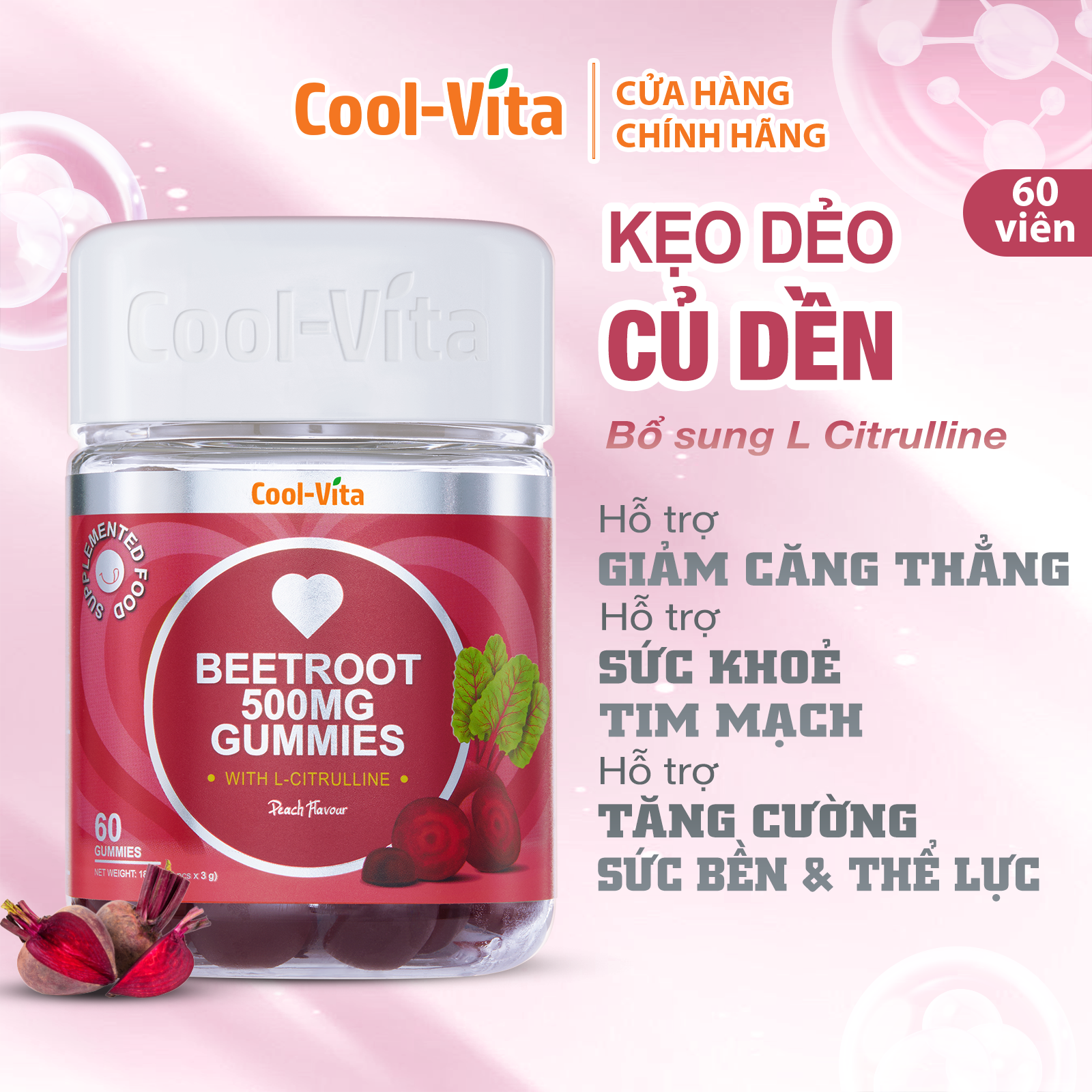 - Không dùng quá 4 viên mỗi ngày. Nhai kỹ trước khi nuốt. ++++++++++Kẹo Dẻo Củ Dền Hỗ Trợ Sức Khỏe Tim Mạch & Giúp Tăng Cường Sức Bền Vị Đào Kết Hợp L-Citrulline Coolvita (60 viênx3g)/hộp++++++++++ Lợi ích nổi bật: Tăng cường sức bền và thể lực: L-Citrulline giúp trì hoãn mệt mỏi cơ bắp, tăng cường khả năng chịu đựng và phục hồi sau tập luyện. Hỗ trợ sức khỏe tim mạch: Bổ sung betaine (choline betaine) và chiết xuất quả táo gai giúp cải thiện lưu thông máu, hỗ trợ sức khỏe tim mạch và tăng cường chức năng tiêu hóa. Tăng cường tiêu hóa: Củ dền chứa nhiều chất xơ và betaine hydrochloride, hỗ trợ sự co bóp của ruột và giữ cho hệ tiêu hóa luôn khỏe mạnh. Giải pháp dinh dưỡng tiện lợi: Kẹo dẻo dễ sử dụng, giúp bạn bổ sung dưỡng chất cần thiết mỗi ngày mà không cần phải pha chế phức tạp. Vì sao nên chọn Kẹo Dẻo Củ Dền COOL-VITA? Dễ dàng bổ sung dinh dưỡng: Kẹo Dẻo Củ Dền CoolVita giúp bạn bổ sung các dưỡng chất thiết yếu mỗi ngày mà không cần phải lo lắng về khẩu vị hay việc chuẩn bị phức tạp. Vị ngọt tự nhiên: Với vị đào ngọt dịu nhẹ và dễ chịu, Kẹo Dẻo Củ Dền CoolVita không gây cảm giác ngán và thích hợp cho cả người lớn và trẻ em. Tiện lợi và hiệu quả: Sản phẩm phù hợp với người tập thể thao, những người muốn tăng cường sức bền hoặc cải thiện sức khỏe tim mạch. Khối lượng tịnh: 180g (60 viên x 3g) Thành phần: Chất tạo ngọt tự nhiên: Siro Maltitol, chất tạo ngọt tự nhiên: Isomalt (23,3%), chất làm dày: Pectin, Chiết xuất củ dền cô đặc (1,67%), L-citrulline (0,83%), quả táo gai, chất điều chỉnh độ acid: Acid citric, hương liệu đào tự nhiên, dầu thực vật (chứa chất chống đông vón: Sáp carnauba). Hướng dẫn sử dụng: