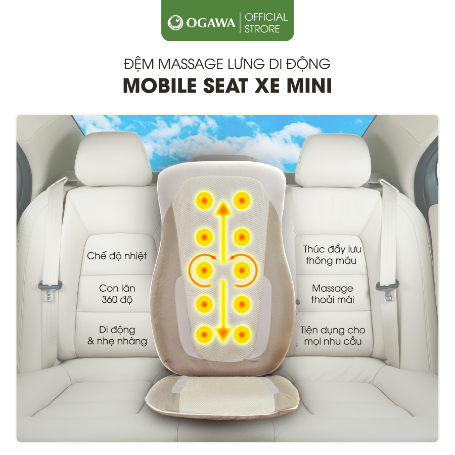 Đệm massage di động OGAWA Mobile Seat Xe Prime mang lại cảm giác thư giãn tuyệt đối với các tác động massage mô sâu trên vai, lưng, eo, đùi, giúp giảm đau cơ mô hiệu
