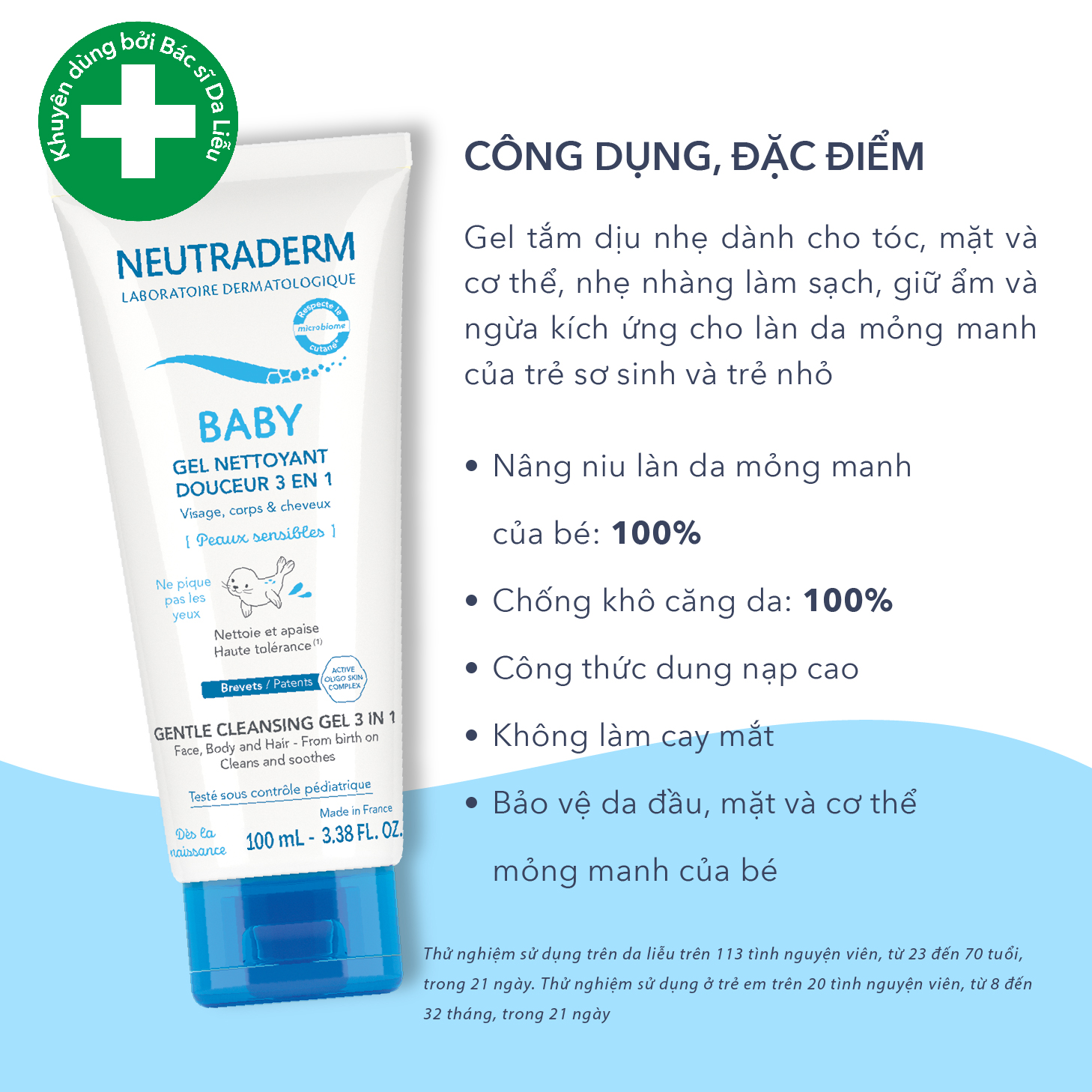 Combo nước biển sâu Marimer Baby Blocked + Gel tắm 3in1 Neutraderm Gel Tắm Gội Cho Bé 3 Trong 1 NEUTRADERM Làm Sạch Dịu Nhẹ An Toàn Cho Da Bé chứa phức hợp hoạt tính Active Oligo Skin Complex chiết xuất từ nước biển IROISE không chỉ làm sạch dịu nhẹ mà còn cung cấp độ ẩm cần thiết bảo vệ làn da mỏng manh của bé. THÔNG TIN SẢN PHẨM Sữa Tắm Cho Bé 3 Trong 1 NEUTRADERM Công dụng: - Tạo màng bảo vệ trên da bé, giúp kháng khuẩn và bảo vệ làn da mỏng manh của bé khỏi các ảnh hưởng từ môi trường như bụi bẩn, ánh nắng, kể cả da đầu - 100% Tôn trọng làn da bé - Không gây khô da sau khi tắm - Không cay mắt - Công thức dung nạp cao. Loại da: Phù hợp với mọi loại da (kể cả da nhạy cảm). 2. MARIMER BABY BLOCKED NOSE AND COLD