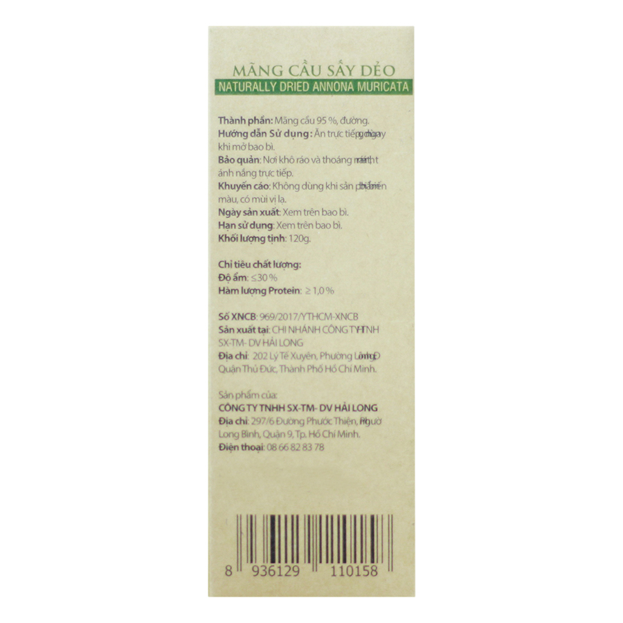 - Sản phẩm được sản xuất trên dây chuyền công nghệ tiên tiến, hợp vệ sinh, an toàn cho người sử dụng. Hạt sen được bảo quản trong hộp đóng kín hơi, nhằm đảm bảo giữ được hương vị tự nhiên của món ăn. Mãng Cầu Sấy Dẻo Hải Long (120g)