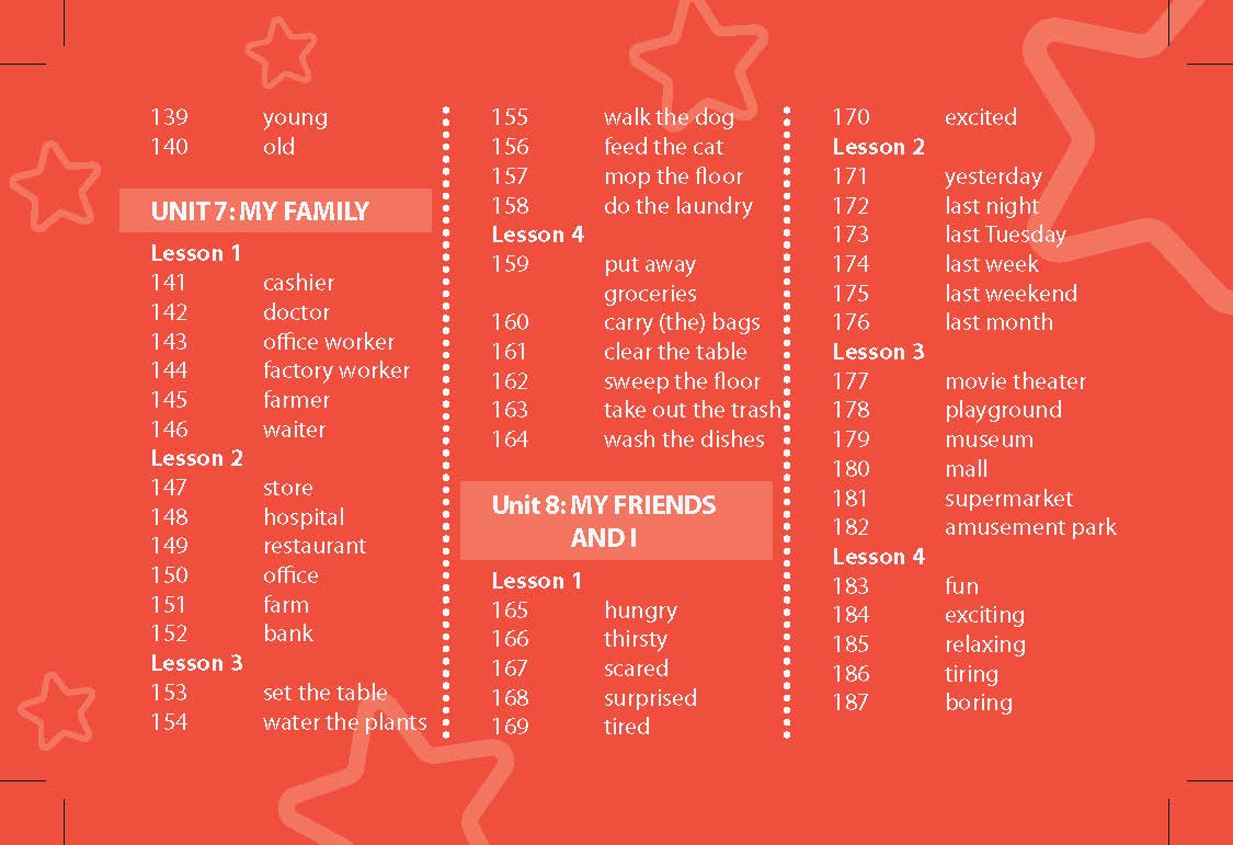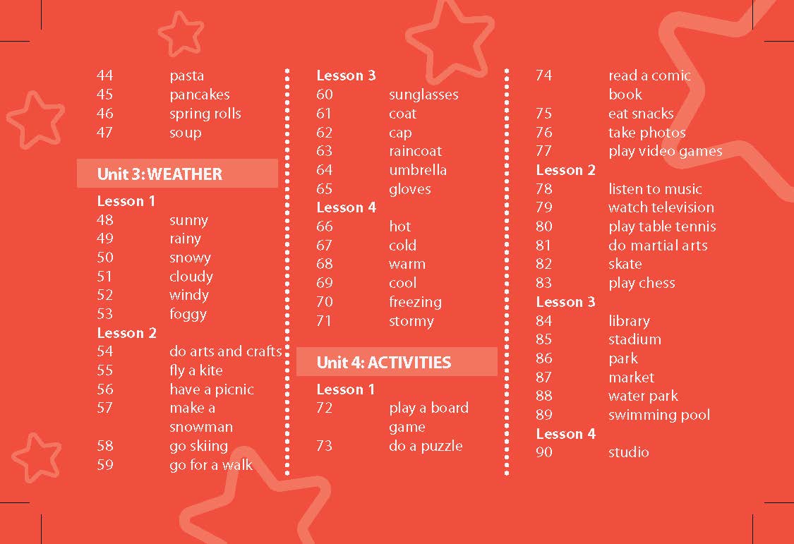 Sách: Learning English 4 - Dành Cho Học Sinh Lớp 4 NỘI DUNG VÀ CẤU TRÚC CỦA QUYỂN SÁCH : Bảng mục lục: Chỉ rõ các mục tiêu chính và trọng tâm của mỗi bài