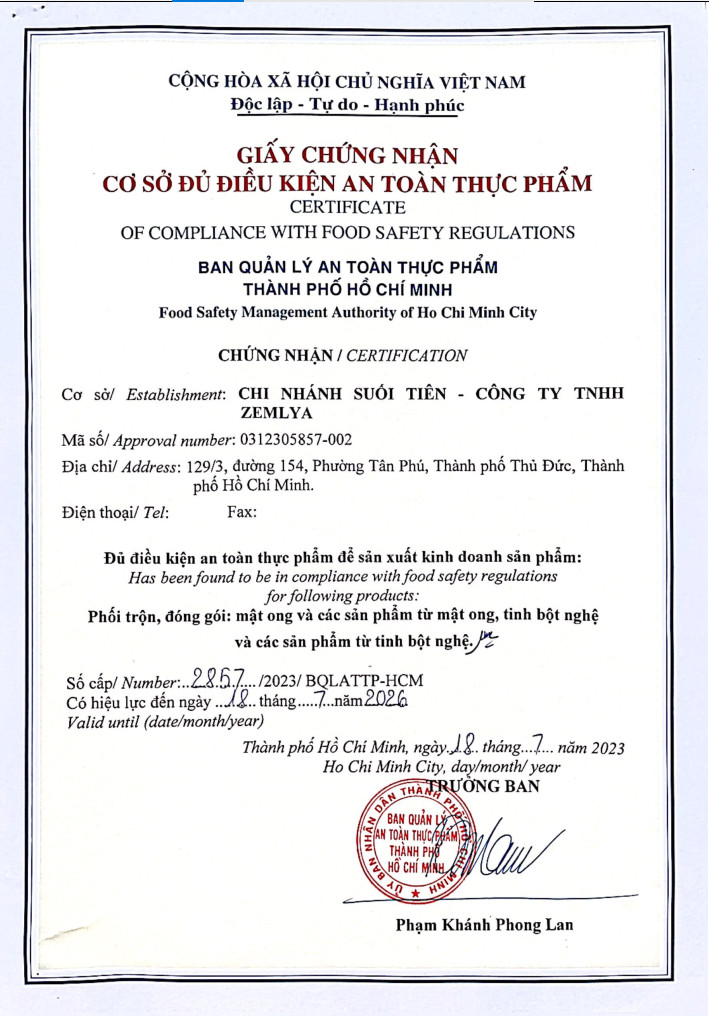 Mật ong Rừng Nhiệt Đới và Honimore là 2 thương hiệu thuộc sở hữu của Công ty TNHH Zemlya, với hơn 40 năm kinh nghiệm trong sản xuất mật ong. Các sản phẩm thuộc 2 thương hiệu này hiện đã có mặt ở tất cả các hệ thống siêu thị lớn của Việt Nam và nước ngoài. -------------------------------------------------------------------------- I. THÔNG TIN SẢN PHẨM - Tên sản phẩm: Mật ong Chanh - Thương hiệu: Rừng Nhiệt Đới - Khu vực khai thác: Các cánh rừng ở khắp 3 miền - Thành phần: 93% mật ong chín và 7% bột chanh - Nhà sản xuất: Công ty TNHH Zemlya (129/3 đường 154, phường Tân Phú, Thành phố Thủ Đức, Tp.HCM) - Quy cách đóng gói: chai thủy tinh - Khối lượng: 360g/chai - Hạn sử dụng: 2 năm kể từ ngày sản xuất - Chứng nhận Vệ sinh an toàn thực phẩm số 2857/2023/BQLATTPHCM do Ban quản lí An toàn thực phẩm TPHCM cấp ngày 18/07/2023 - Giấy kiểm nghiệm số AR-23-VD-065594-01 được cấp bởi Eurofins II. ĐẶC ĐIỂM NỔI BẬT Mật ong chanh là sản phẩm tiện lợi 2 trong 1, là sự kết hợp tinh túy