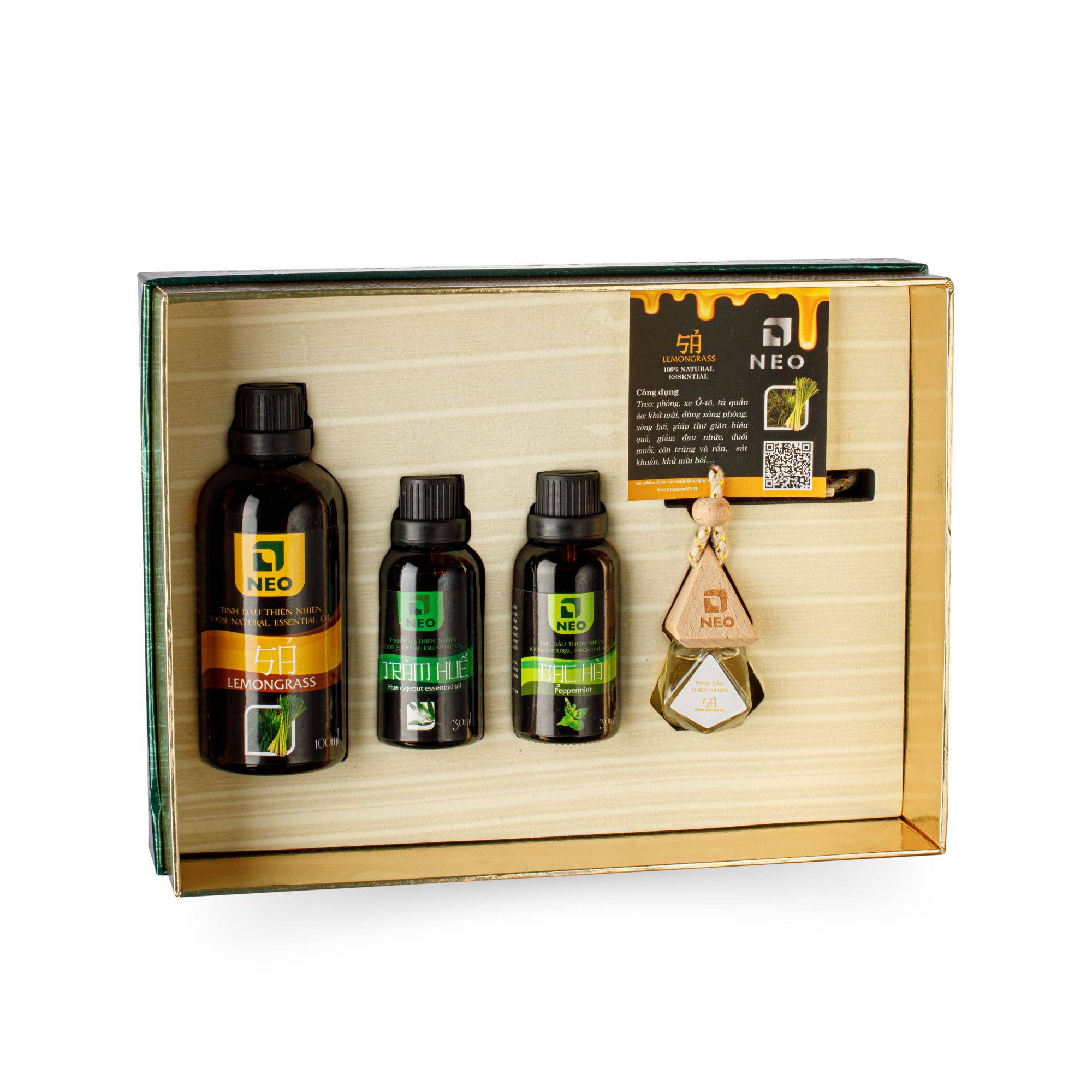 Combo Tinh dầu thiên nhiên bao gồm: 100ml Sả + 30ml Tinh dầu Tràm Huế + 30ml Tinh dầu bạc hà + 8ml Tinh dầu Quế hoặc Sả