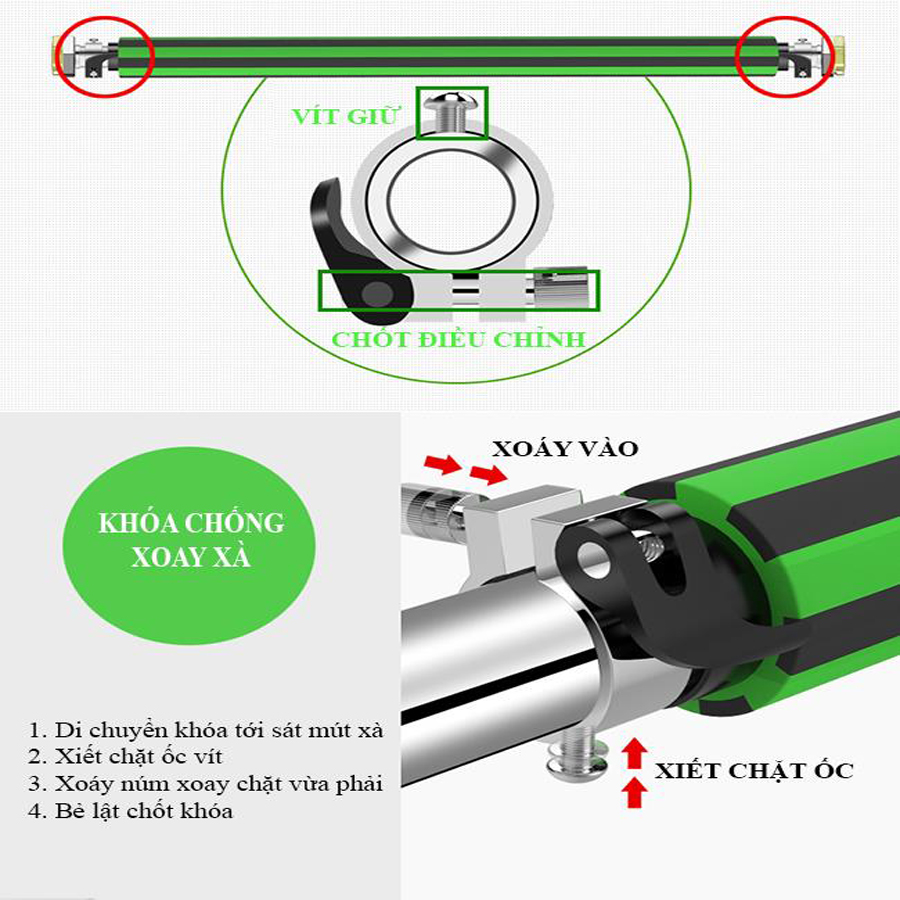 - Tiếp theo xoay 2 đầu ra ra bằng nhau cho tới khi 2 mặt cao su dính vào 2 bề mặt lắp,dùng 1 tay giữa đầu xà,còn tay kia vặn ở giữa thân xà ngược chiều với chiều vặn 2 đầu xà ban đầu.Vặn cho tới khi thật chặt.