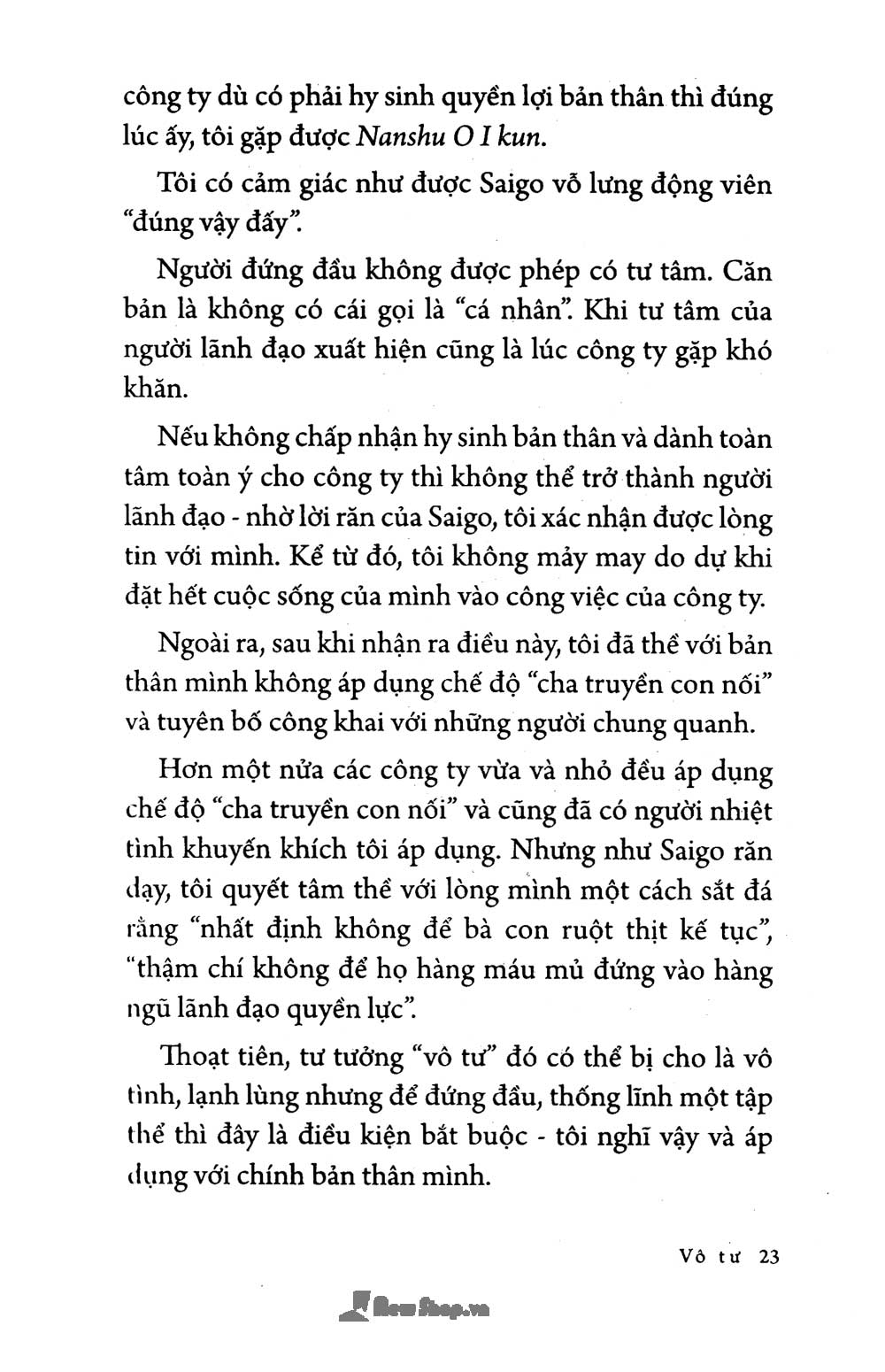 Đây là một cuốn sách "2 trong 1", bạn đọc sẽ được tìm hiểu cùng một lúc, triết lý kinh doanh của một nhà kinh doanh tài ba hàng đầu Nhật Bản hiện đại - Inamori Kazuo, và tư tưởng làm người mẫu mực của một võ sĩ samurai chân chính bậc nhất nước Nhật thời Minh Trị Duy Tân - Saigo Takamori.