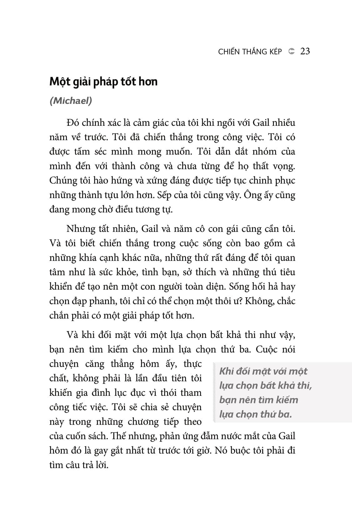 Trong sách “Công việc thành công - Cuộc đời như ý” (Win at Work và Succeed at Life, tác giả bán chạy nhất của New York Times - Michael Hyatt và Giám đốc điều hành - Megan Hyatt Miller) đã vạch trần những người nổi tiếng ủng hộ “làm việc quá sức" và chỉ cho bạn cách đạt được thành công trong công việc mà không phải hy sinh cuộc sống cá nhân của mình - một khái niệm được gọi là “Chiến thắng kép”.