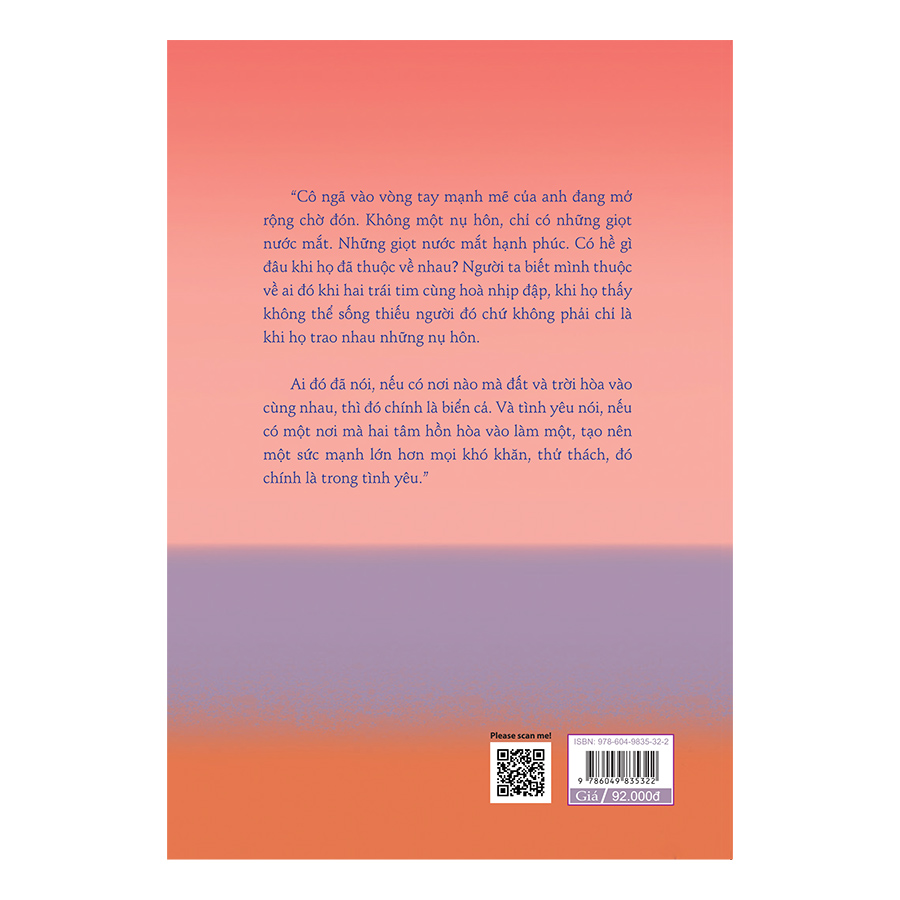 - Không! Anh chỉ yêu em thôi. Hãy để anh được ở bên em, hãy để anh đi cùng em, đến bất cứ nơi nào, đến cuối cuộc đời, em nhé? Cô ngã vào vòng tay mạnh mẽ của anh đang mở rộng chờ đón. Không một nụ hôn, chỉ có những giọt nước mắt. Những giọt nước mắt hạnh phúc. Có hề gì đâu, khi họ đã thuộc về nhau? Người ta biết mình thuộc về ai đó khi hai trái tim cùng hoà nhịp đập, khi họ thấy không thể sống thiếu người đó chứ không phải chỉ là khi họ trao nhau những nụ hôn. Ai đó đã nói, nếu có nơi nào mà đất và trời hoà vào cùng nhau, thì đó chính là biển cả. Và tình yêu nói, nếu có một nơi mà hai năm hoà vào làm một, tạo nên một sức mạnh lớn hơn mọi khó khăn, thử thách, đó chính là trong tình yêu…”