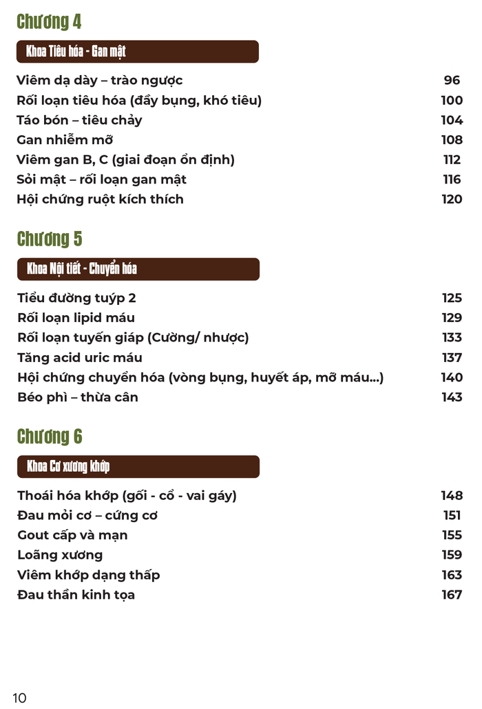 Cuốn sách gồm 9 chương, đây chính là cẩm nang dinh dưỡng theo từng bệnh, hướng dẫn món ăn cụ thể giúp hỗ trợ điều trị, giảm thuốc, ngừa tái phát, tăng cường sức khỏe lâu dài.