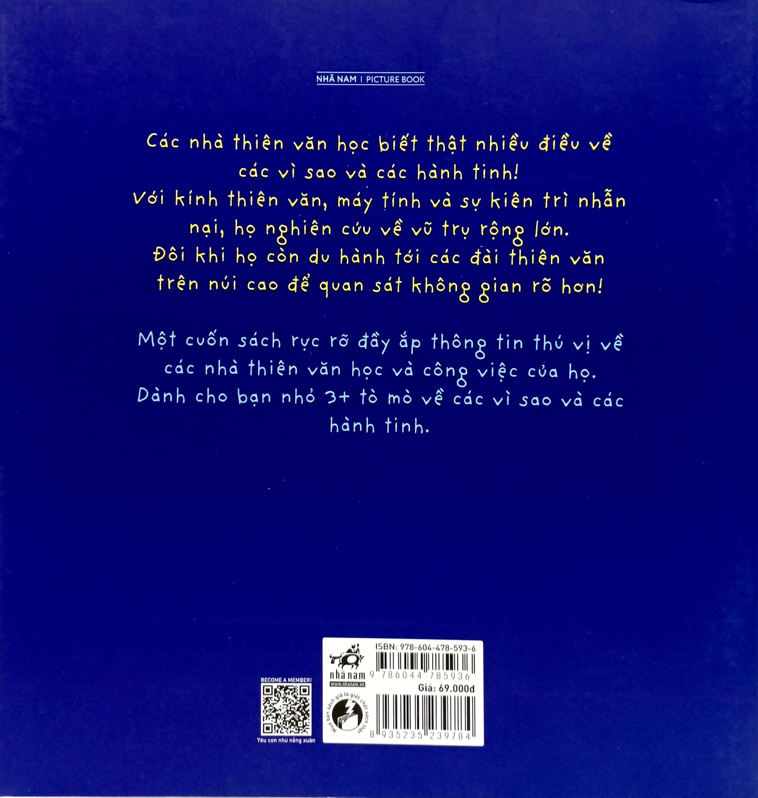 Mua tại TiktokCuốn Sách Lớn Rực Rỡ Về - Nhà Thiên Văn Học (Kèm Từ Vựng Song Ngữ) Các nhà thiên văn học biết thật nhiều điều về các vì sao và các hành tinh! Với kính thiên văn, máy tính và sự kiên trì nhẫn nại, họ nghiên cứu về vũ trụ rộng lớn. Đôi khi họ còn du hành tới các đài thiên văn trên núi cao để quan sát không gian rõ hơn! Một cuốn sách rực rỡ đầy ắp thông tin thú vị về các nhà thiên văn học và công việc của họ. Dành cho bạn nhỏ 3+ tò mò về các vì sao và các hành tinh.