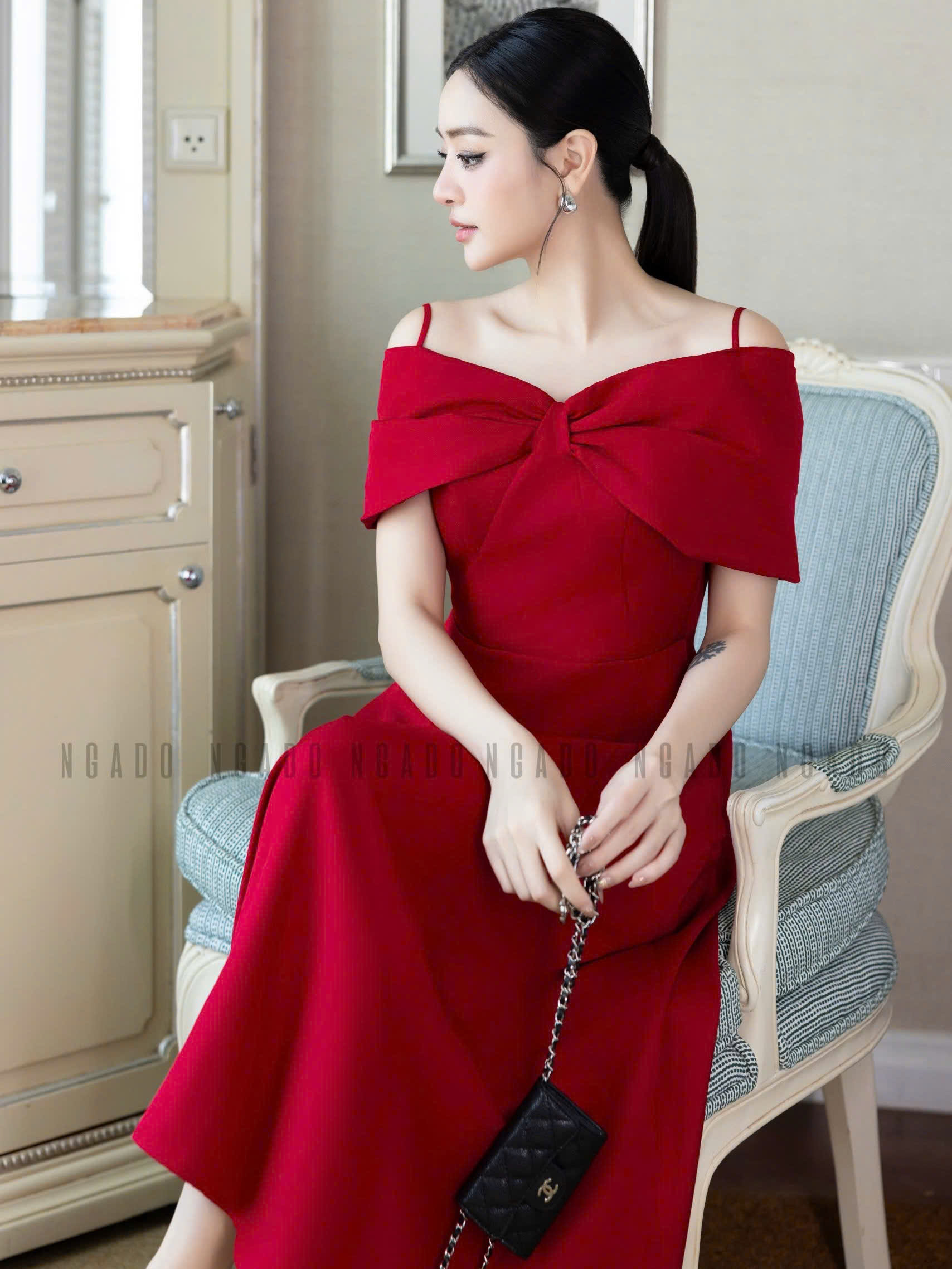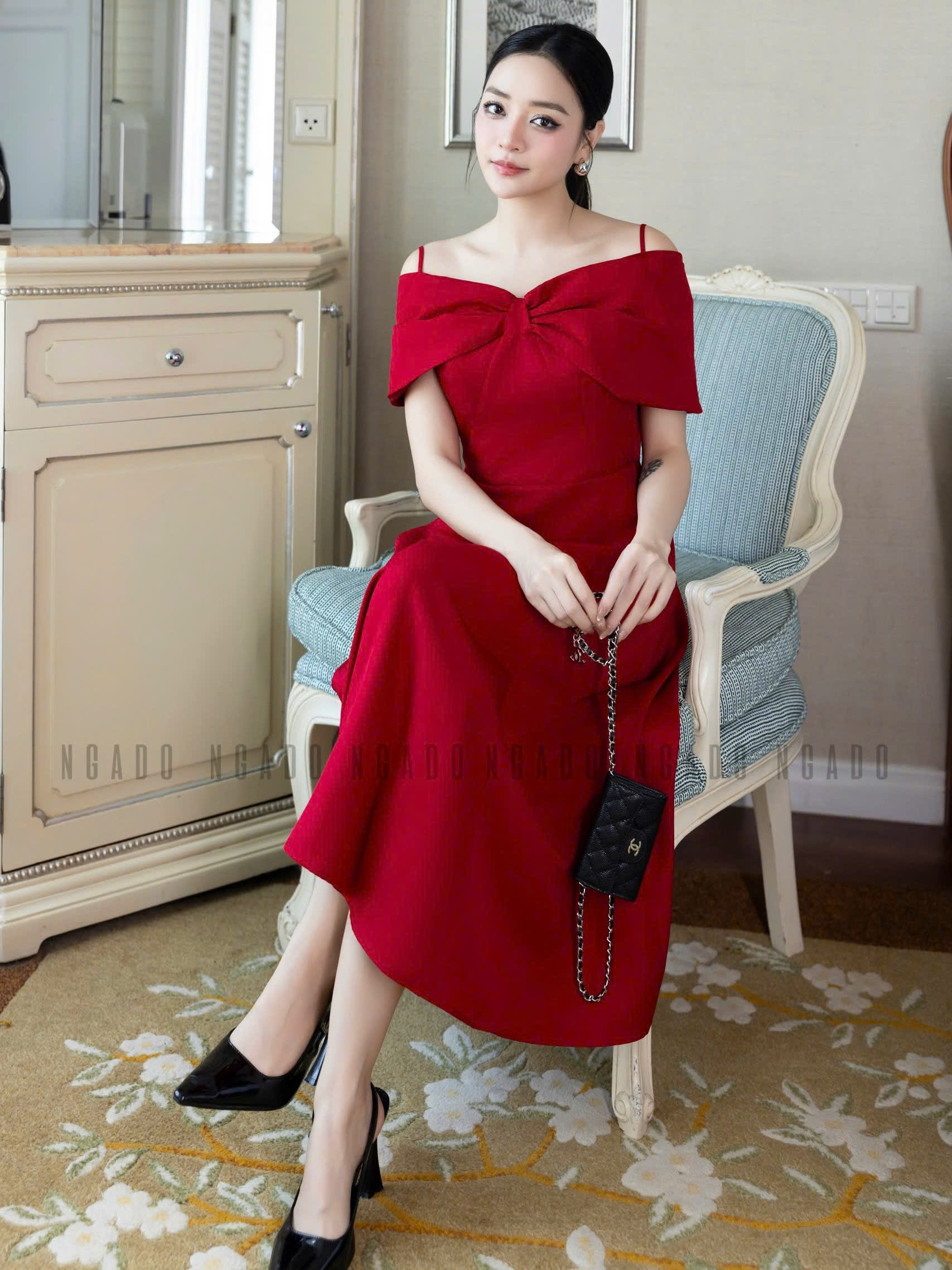 ✨Đầm đỏ bẹt vai NGADO , đầm xòe dáng dài , đầm dự tiệc