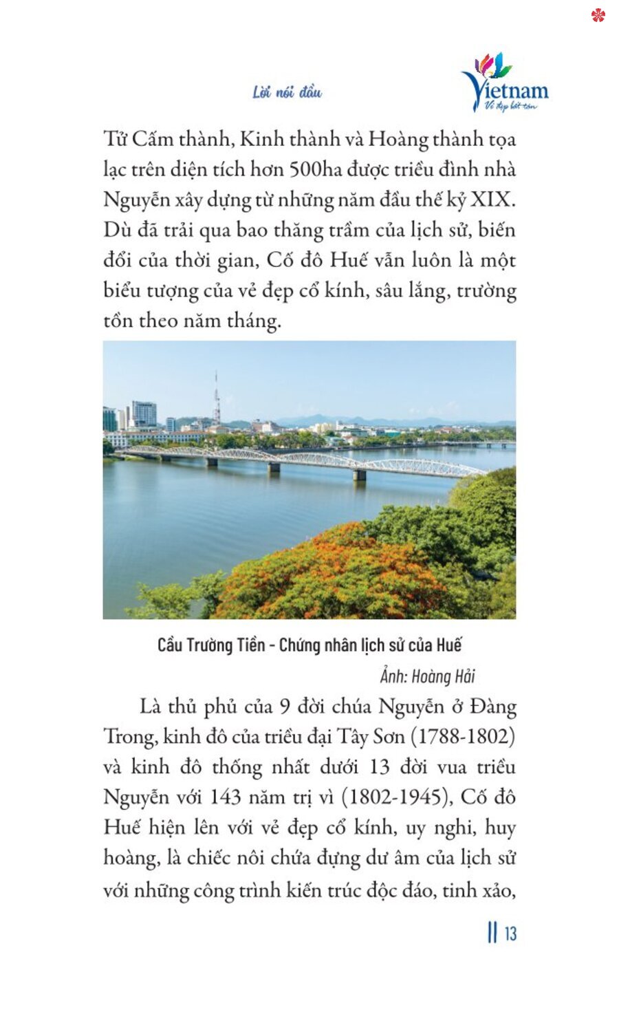VIỆT NAM CHÚNG TA - KẾT TINH CỦA LỊCH SỬ HÀO HÙNG, THIÊN NHIÊN TƯƠI ĐẸP CÙNG SỨC SÁNG TẠO VÔ BIÊN CỦA CON NGƯỜI. Bạn biết không, đất nước của chúng mình đẹp lắm. Từ những dòng thác tung bọt trắng xóa vùng Tây Bắc đến dòng Cửu Long chở nặng phù sa miền Tây Nam Bộ, từ núi rừng bao la nơi sinh sống của nhiều loài động vật quí hiếm đến vùng hải đảo nơi có những giàn khoan tung bay lá cờ đỏ sao vàng, từ những miền đất cổ kính với bề dày lịch sử đến các thành phố trẻ trung tràn đầy sức sống... tất cả hội tụ trên dải đất hình chữ S tươi đẹp, như một di sản tuyệt vời qua hàng ngàn năm dựng nước và giữ nước mà giờ đây cha ông trao lại cho chúng mình. Hành trình đi dọc theo đất nước từ Bắc vào Nam, lên rừng xuống biển cũng là hành trình khám phá nền văn hóa đặc sắc và đa dạng của cộng đồng 54 dân tộc anh em. Dù chúng mình đang ở nơi đâu trên dải đất hình chữ S, thì bạn và tôi luôn hiểu rằng con đường mình đang đi, món ăn mình đang thưởng thức, công trình mình đang chiêm ngưỡng đều mang theo dấu ấn của lịch sử, của tinh hoa văn hóa đúc kết từ bao đời. Tất cả tạo nên những hoa văn đặc sắc, vừa khác biệt, vừa hòa quyện vào nhau, tạo nên vẻ đẹp lung linh của đất nước gấm hoa. Ngày 12/6/2025 đánh dấu một cột mốc lịch sử của dân tộc khi Quốc hội thông qua Nghị quyết số 202/2025/QH15 - "sắp xếp lại giang sơn" để cả dân tộc bước vào tương lai mới. Nhớ về quá khứ để hướng tới tương lai, Nhà xuất bản Kim Đồng phát hành ấn bản Đất nước gấm hoa phiên bản đặc biệt, lưu dấu những nét văn hoá, địa lí và lịch sử của 63 tỉnh thành trước thềm kỉ nguyên mới của đất nước. Mời bạn cùng thăm lại những miền lưu dấu xuyên suốt dải đất hình chữ S xinh đẹp của chúng ta nhé! **Thông tin về tên gọi, địa giới hành chính, dân số của 63 tỉnh, thành phố trong ấn phẩm này được ghi nhận trước thời điểm Nghị quyết số 202/2025/QH15 ngày 12/6/2025 về việc sắp xếp đơn vị hành chính cấp tỉnh được Quốc hội thông qua. ---