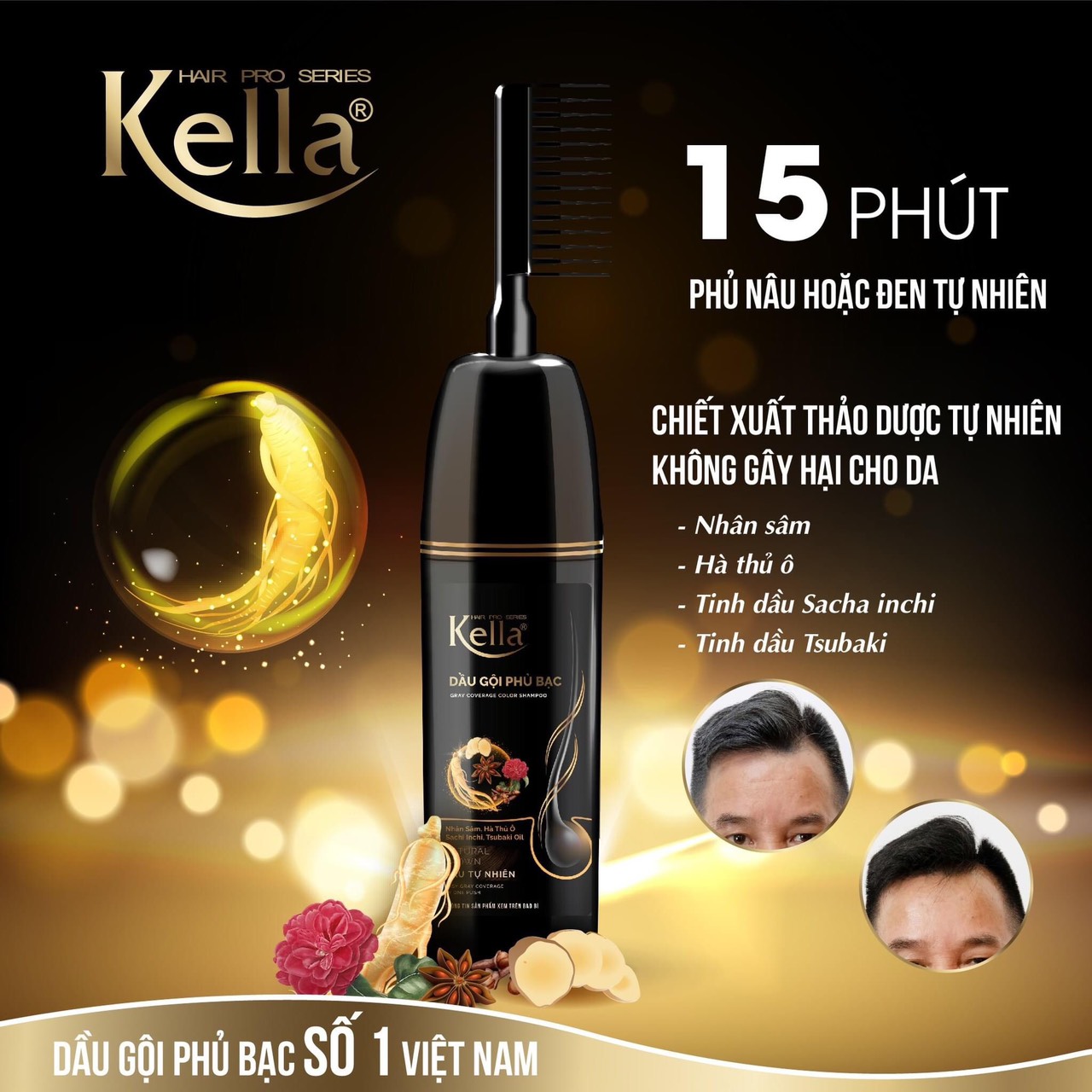 • Mái tóc bạc khô cứng, chẻ ngọn, rụng từng mảng được thay thế bằng mái tóc đen nâu, óng mượt, sạch gàu nhờ Dầu Gội Phủ Bạc Kella.