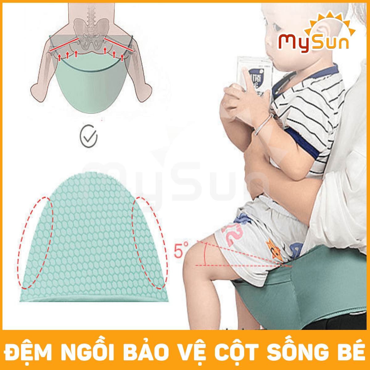 GIỚI THIỆU Ba mẹ sẽ không còn cảm thấy khó khăn khi phải vừa ôm bế con vừa lái xe máy nữa. Hãy mua ngay chiếc đai địu vải lưới có bệ ngồi 4 tư thế cho trẻ sơ sinh, em bé tuổi đi chơi hay ngồi xe máy được an toàn nhất. Địu ngồi MySun có nhiều tư thế ngồi phù hợp với em bé 1 2 3 … 36 tháng tuổi. Đặc biệt, địu sử dụng công nghệ dệt vải lưới Air Mesh tạo không khí thông thoáng cho bé.