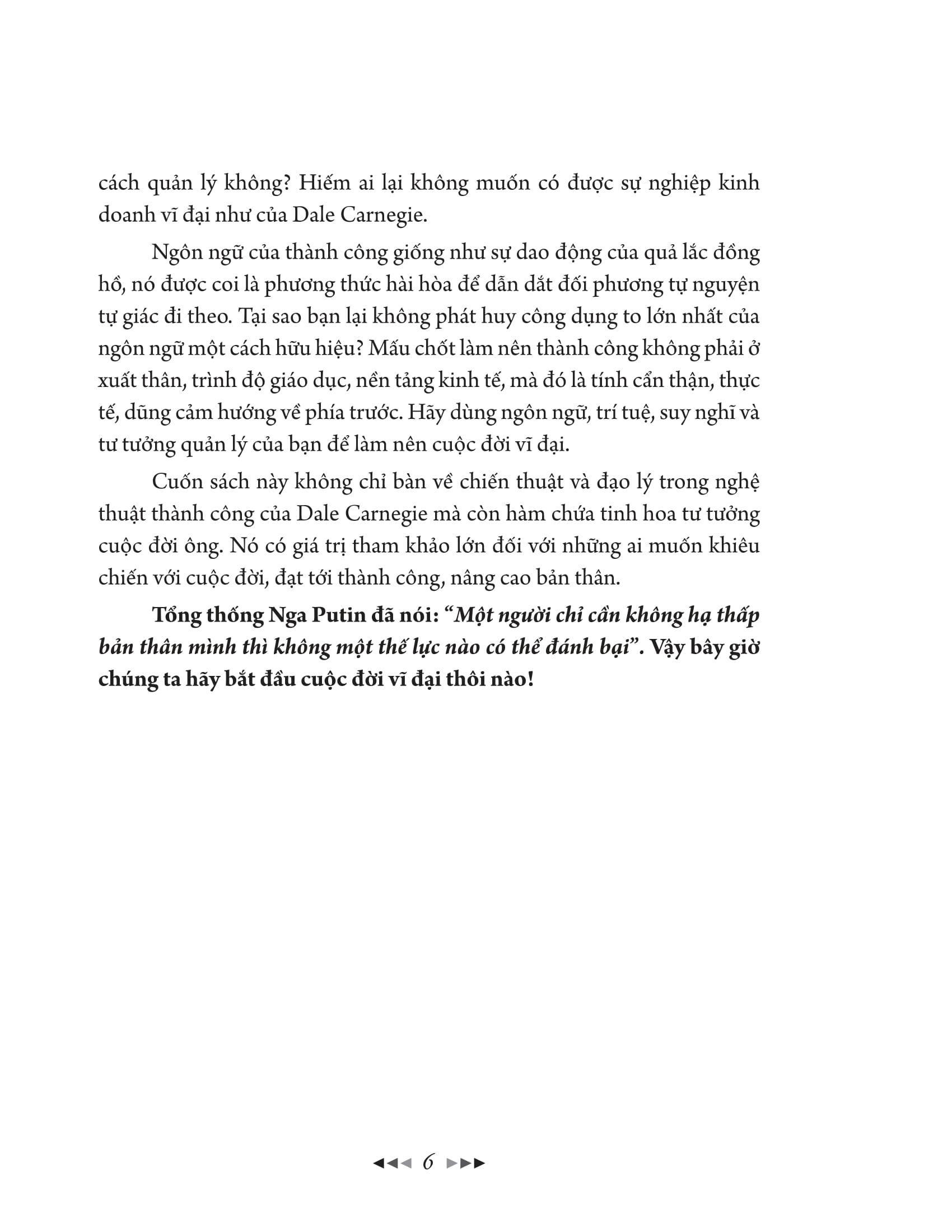 Nghệ thuật và tài năng kinh doanh xuất chúng của ông khiến mỗi một thành công đều khiến nhân loại hướng về. Dale Carnegie trở thành biểu tượng của chủ nghĩa hoàn mỹ trong giới quản lý trên thế giới, nhận được sự sùng bái và ngưỡng mộ của nhân loại. Dale Carnegie còn là một bậc thầy về ngôn ngữ. Trong thời đại internet hiện nay, phương thức quan hệ quốc tế biến đổi rất nhanh chóng, mỗi một cá nhân với xuất thân, tính cách, sở thích khác nhau, trong cuộc sống hay trên thương trường, chính trường đều cần có tài ăn nói và khả năng thuyết phụ Nhờ vậy mới có được sự coi trọng từ cấp trên và đồng nghiệp, sự yêu mến của cấp dưới, sự tin tưởng của khách hàng, có được tình yêu cũng như tình bạn tốt đẹp. Có thể diễn đạt một cách rõ ràng, ngắn gọn để thuyết phục người khác trong một thời gian ngắn hay không, đó chính là vấn đề mấu chốt dẫn tới thành công.