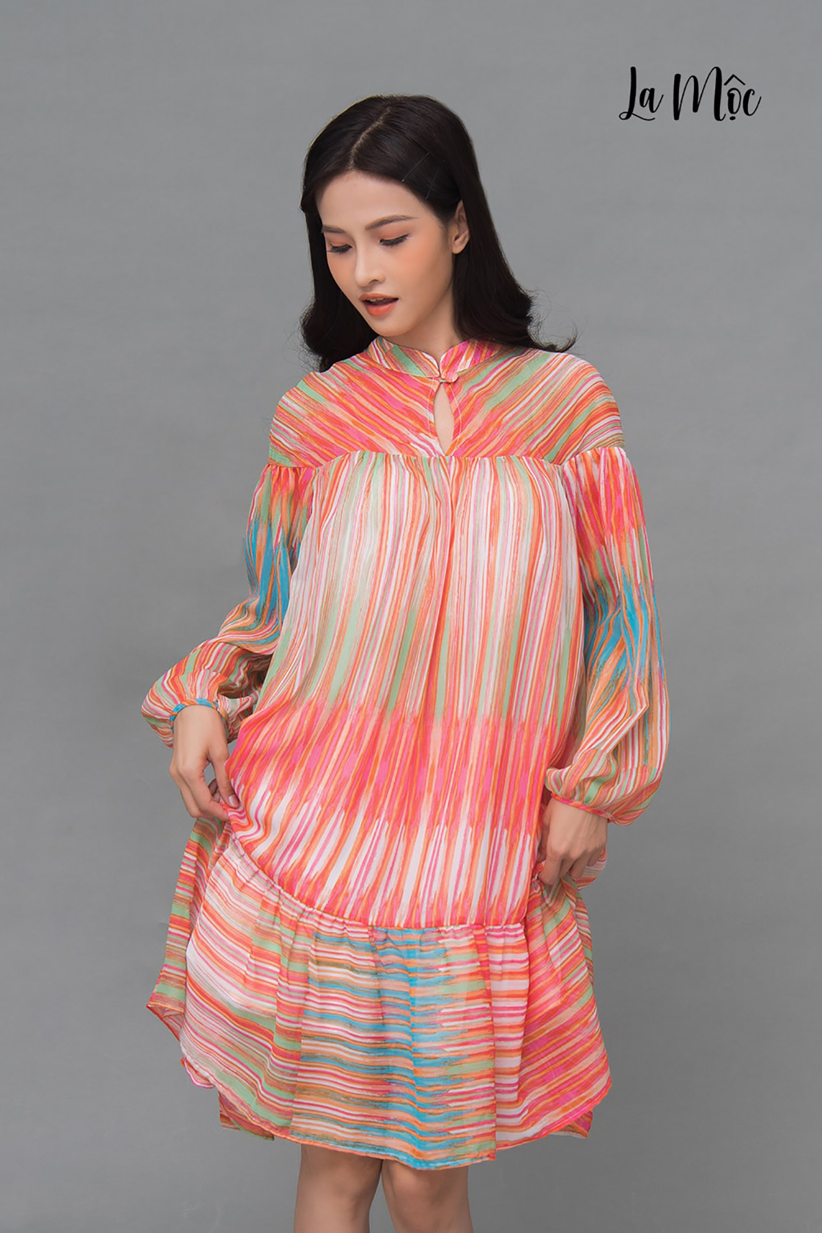 - Thông tin sản phẩm Mã sản phẩm: LM72103 Chất liệu: CHIFFON SỌC KOREA Đặc điểm: Cổ trụ, nhún đô, nhún béo ở từng đầm, tay dài phồng ở cửa tay.