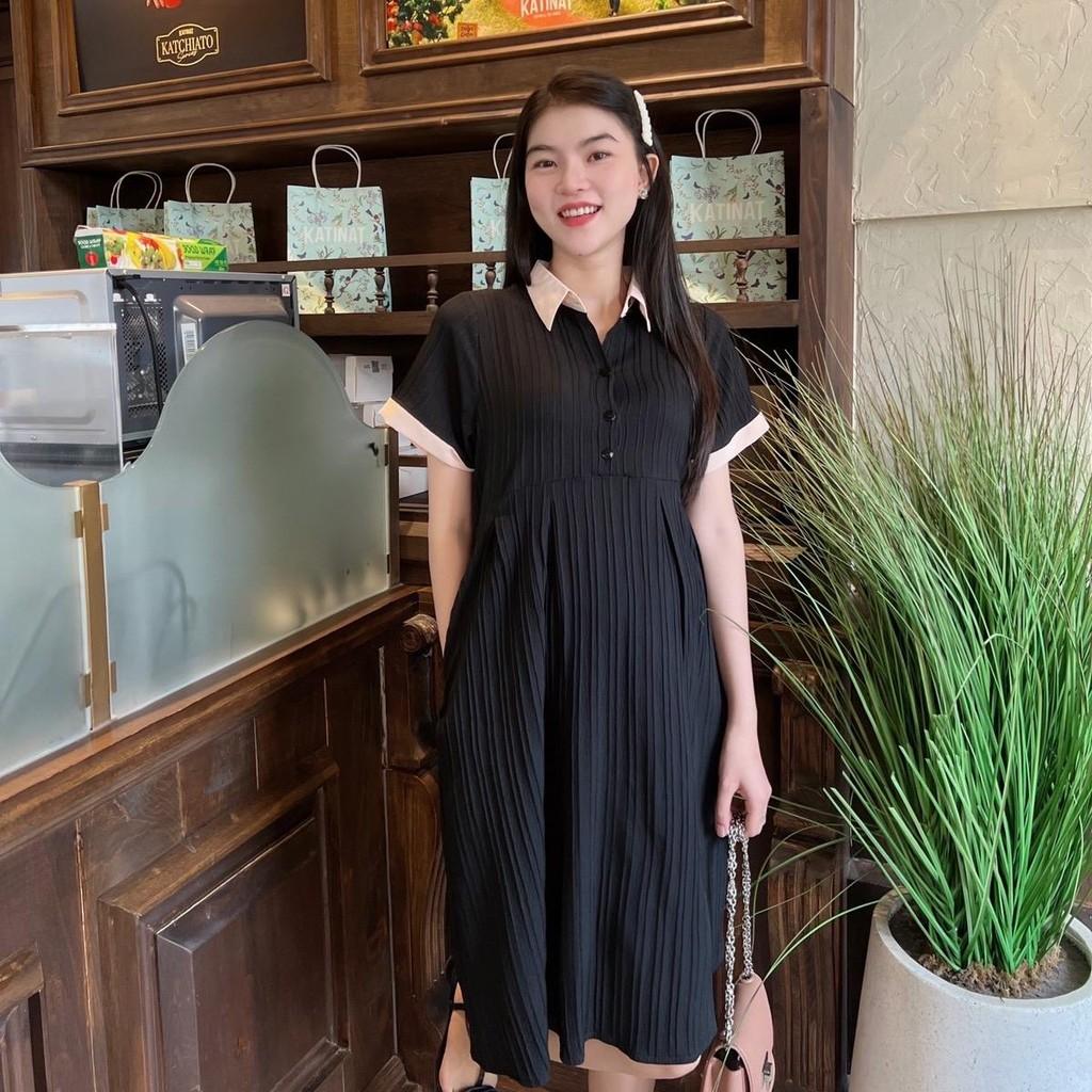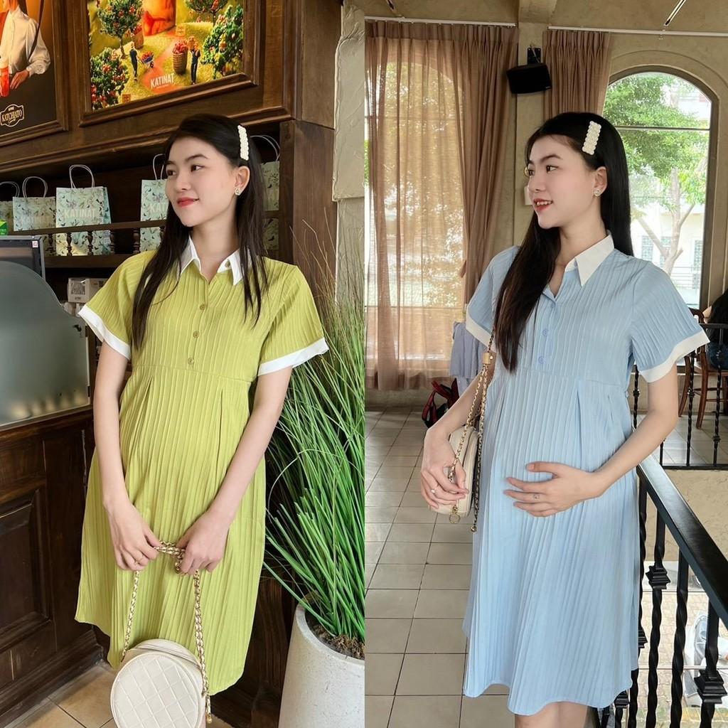 Đầm bầu babydoll đũi gân cổ sơ mi thanh lịch, phối màu bầu diện dễ thương, trẻ trung, năng động.