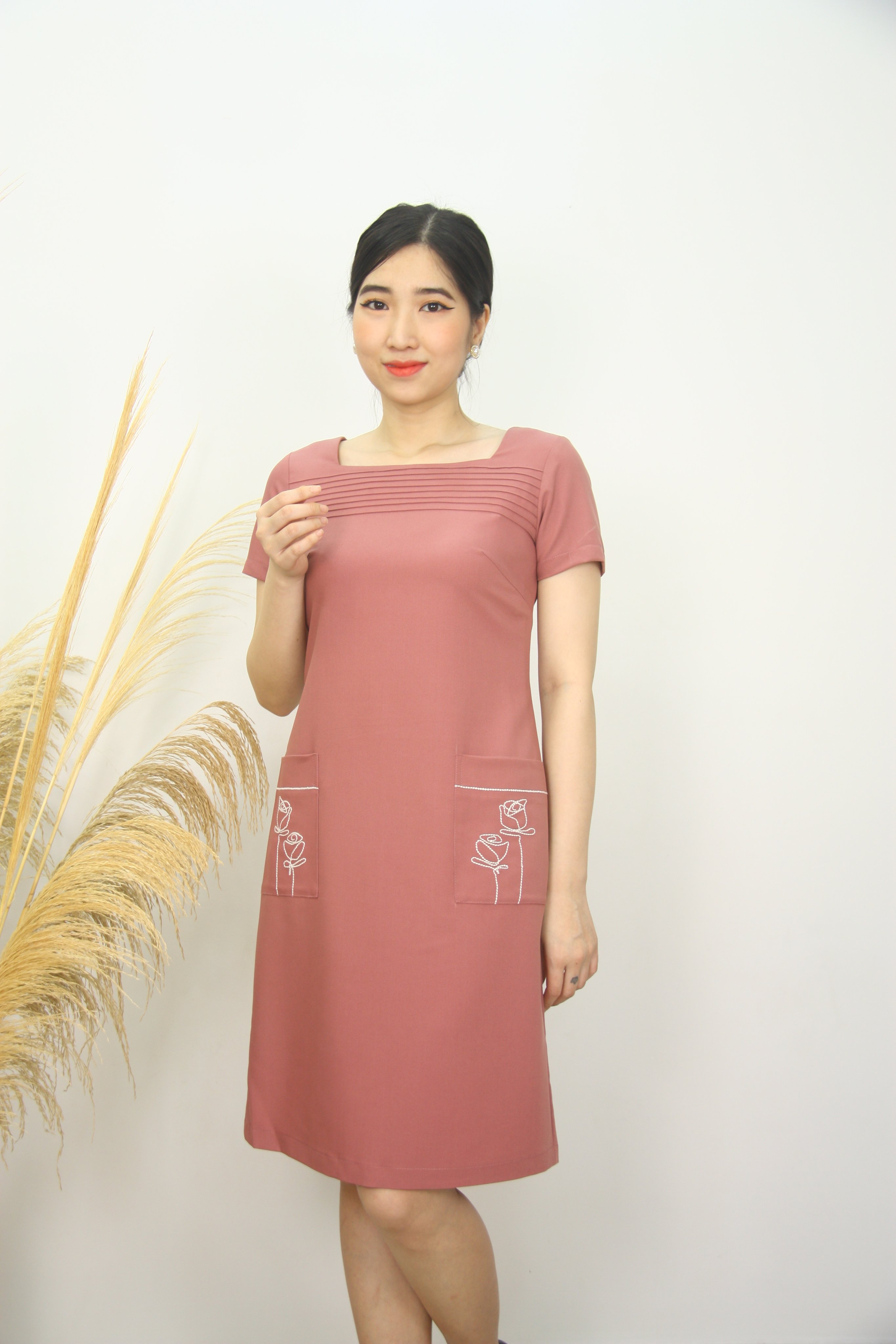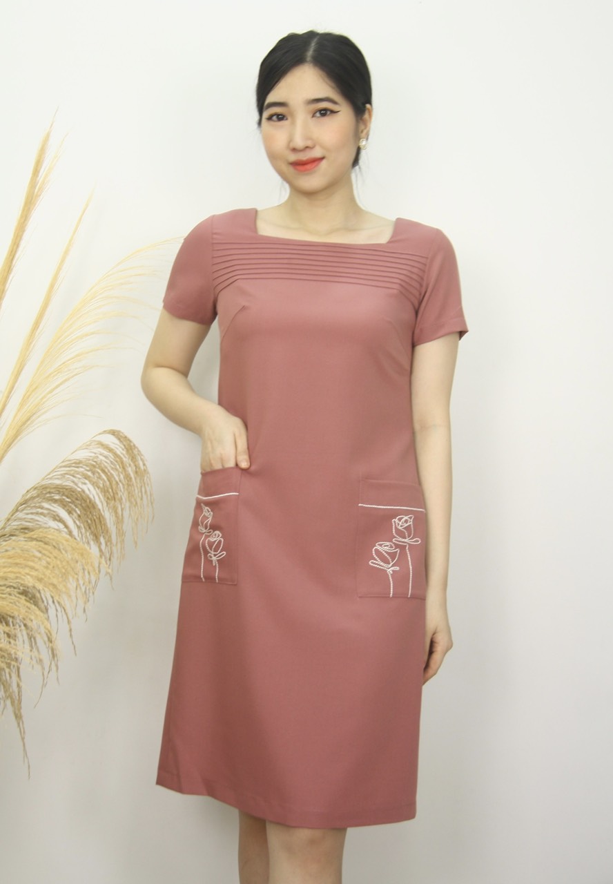 - Thiết kế đầm dáng suông thoải mái dễ mặc, những chị có phần eo hơi tròn 1 chút thì không cần lo vì đầm thiết kế che bụng rất tinh tế. Hai túi thêu hoa độc đáo, sang trọng.