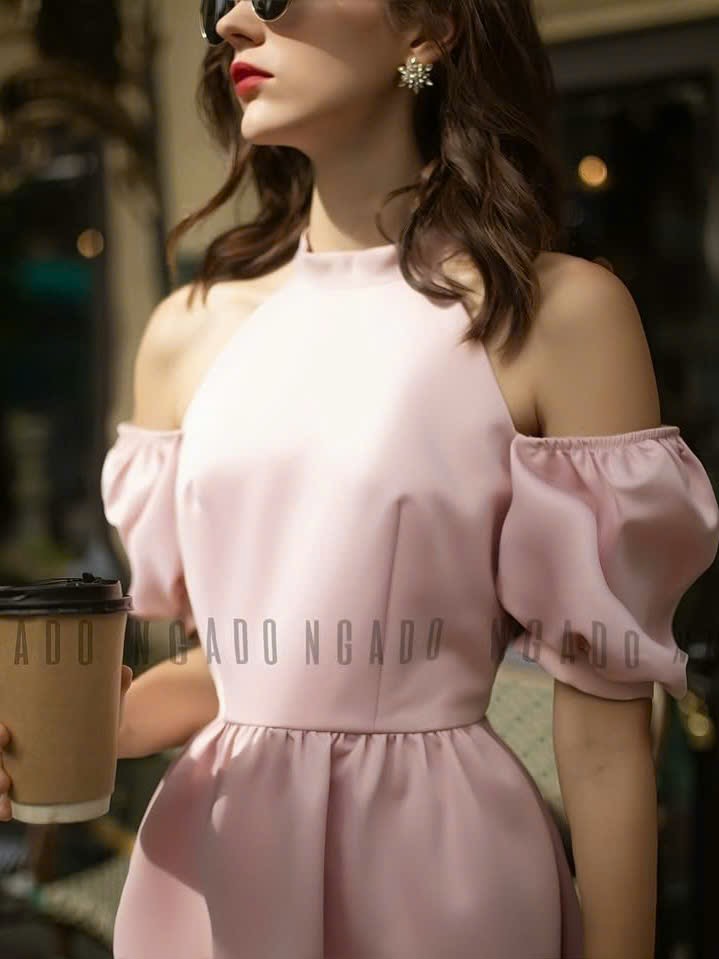 ✨Đầm hồng cổ yếm tay phồng NGADO , đầm cổ yếm , đầm kiểu Nữ