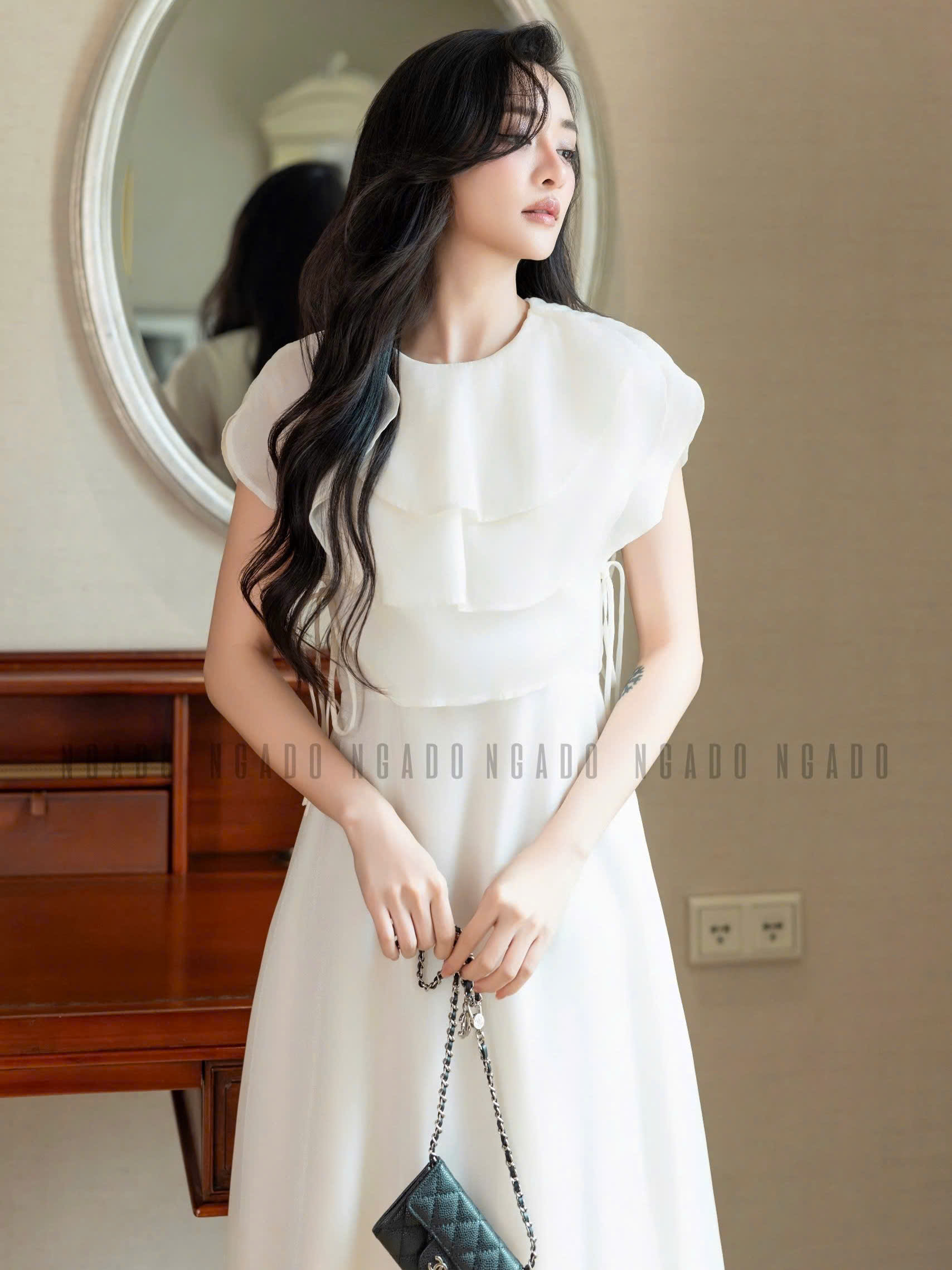 ✨Đầm kem cổ xếp tầng NGADO , đầm xòe