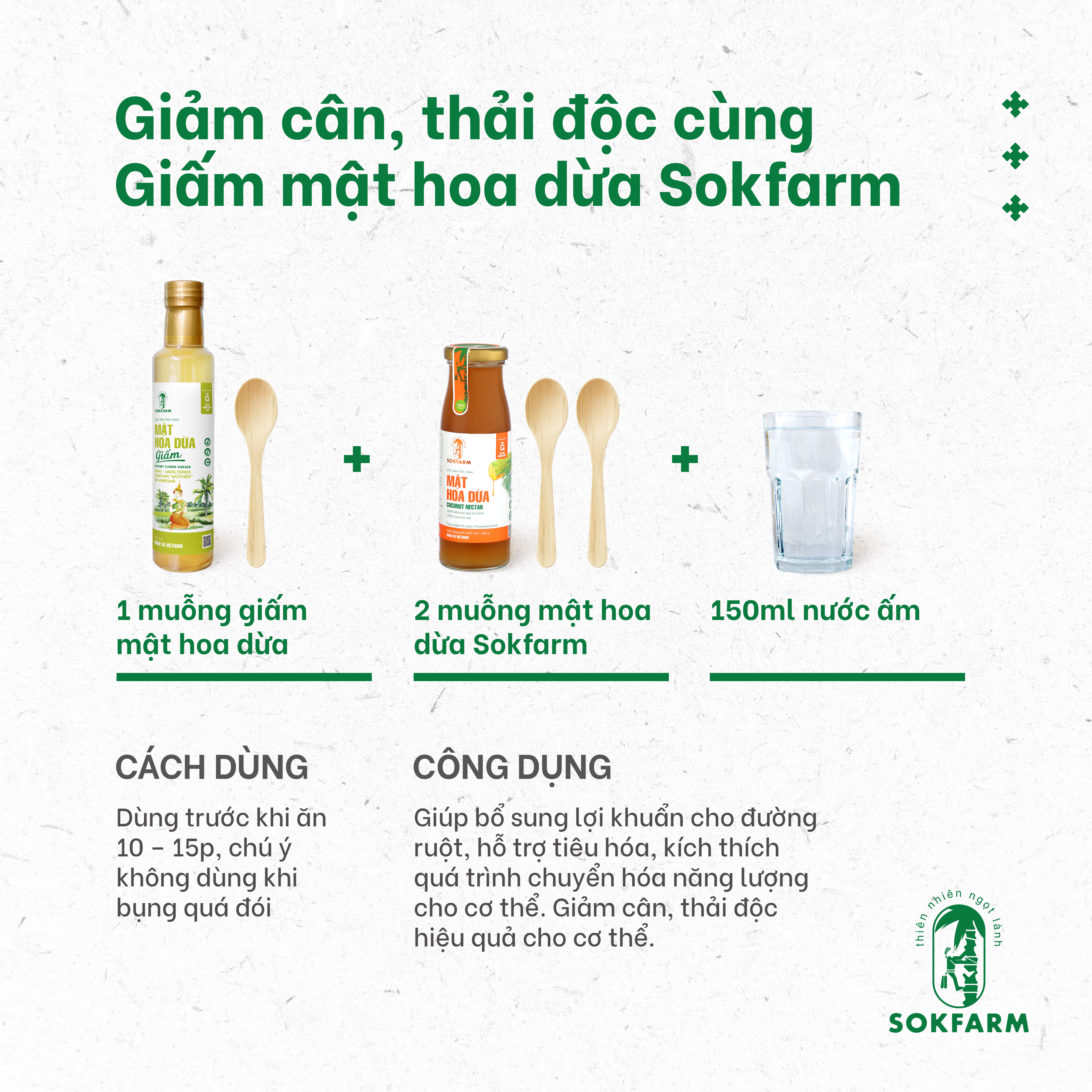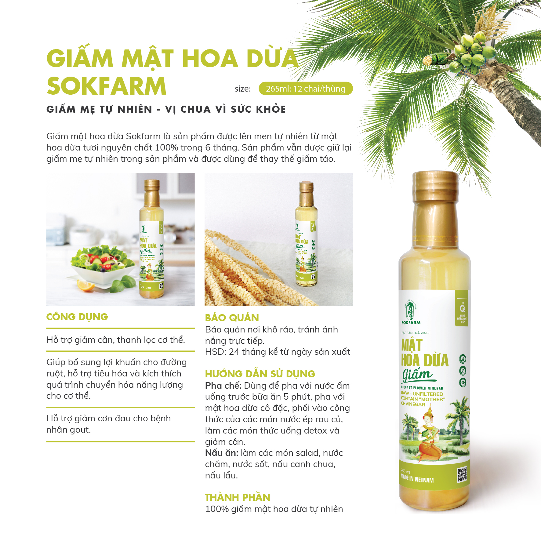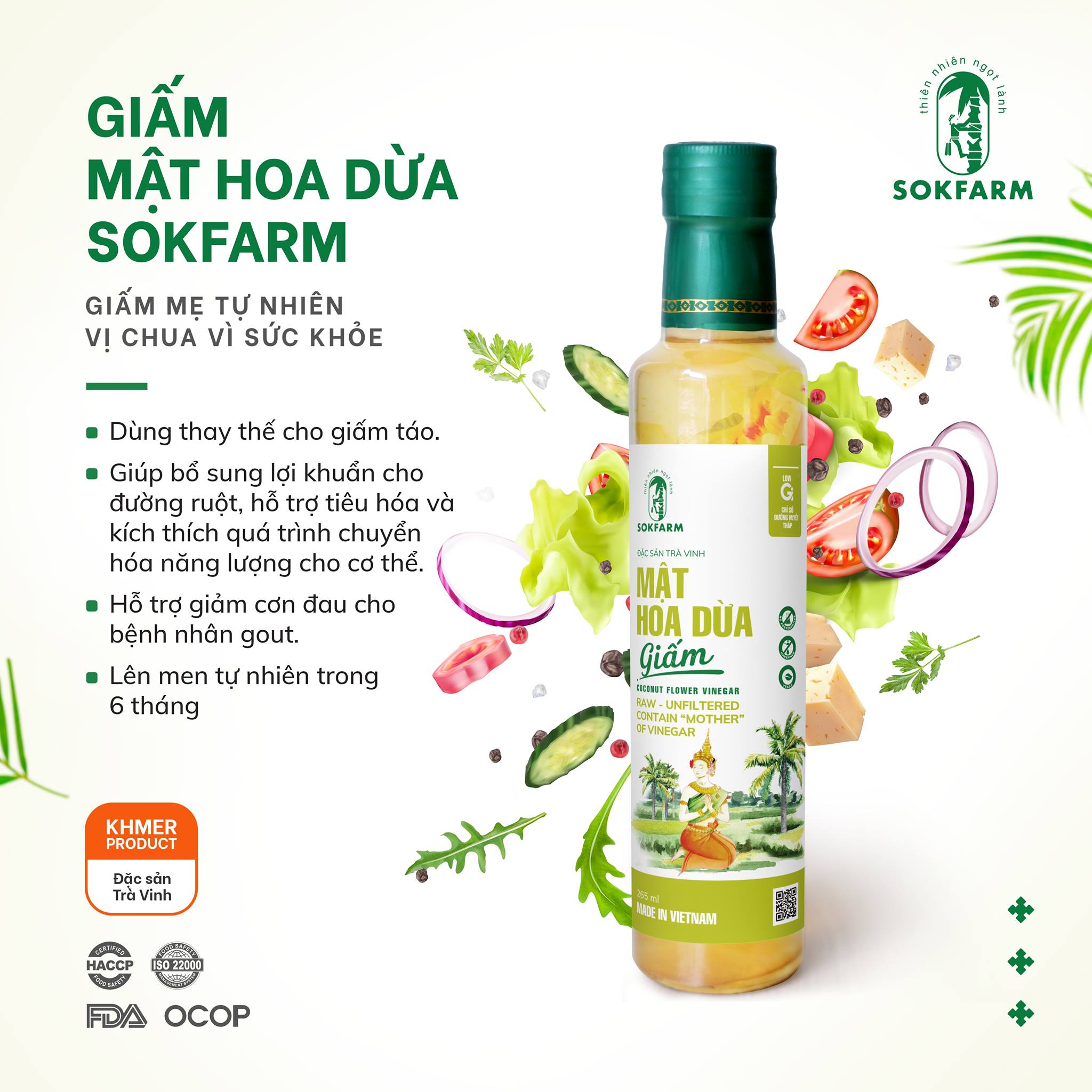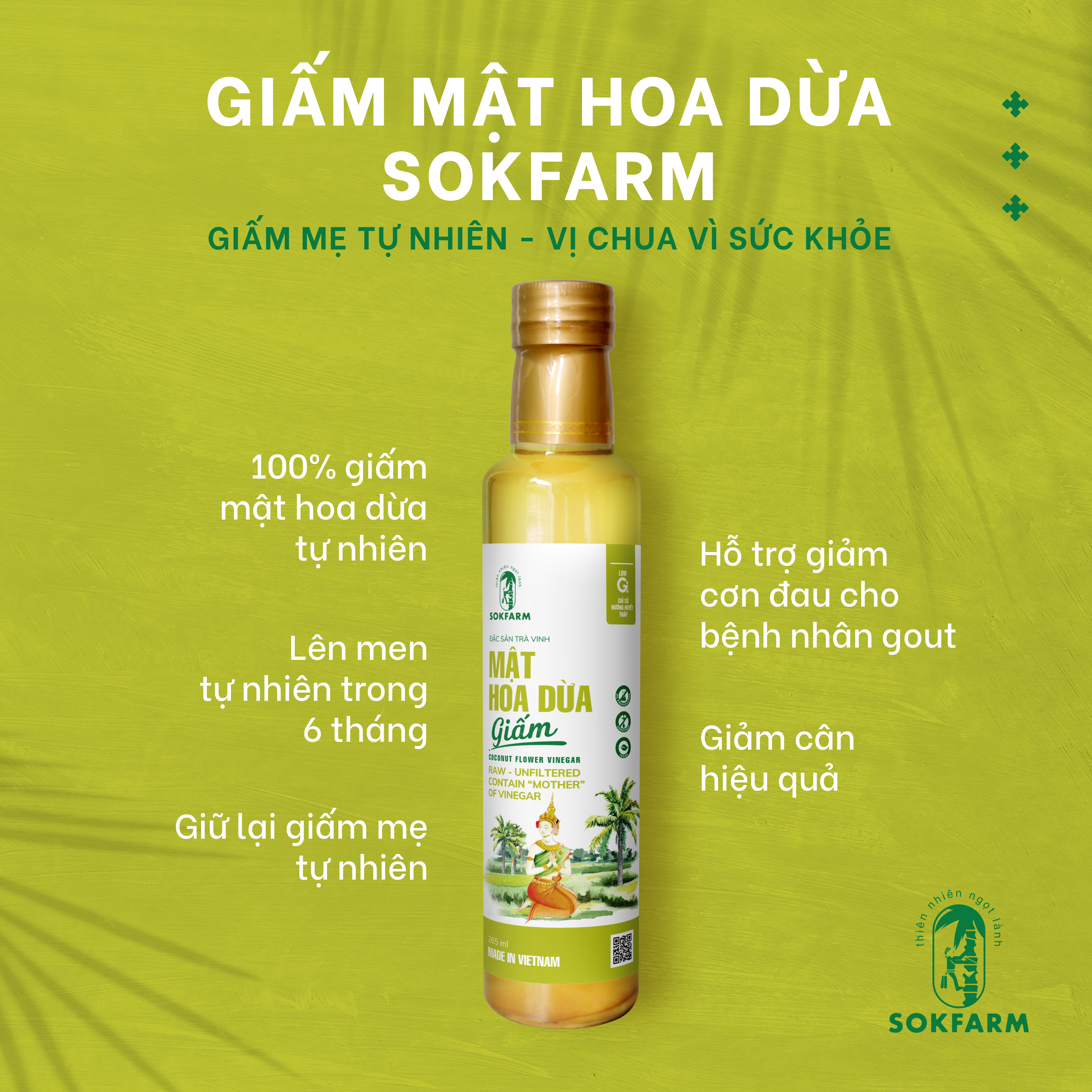 Giấm mật hoa dừa Sokfarm là sản phẩm được lên men tự nhiên từ mật hoa dừa tươi nguyên chất 100$ trong 6 tháng. Sản phẩm vẫn được giữ lại giấm mẹ tự nhiên và được dùng để thay thế giấm táo