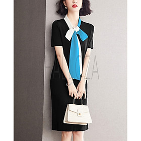 Chất: cotton lụa phối tay voan Màu: đen Kiểu dáng: đầm ôm, cổ vest, tay voan dài càu nút cổ tay, xẻ tà trước 2 bên, kèm nịt rời, dây kéo sau lưng Size: M
