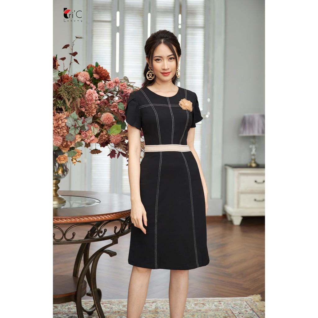 ✨Đầm ôm A Tri'C Luxury diễu chỉ nổi ngực cài hoa Đen A18120
