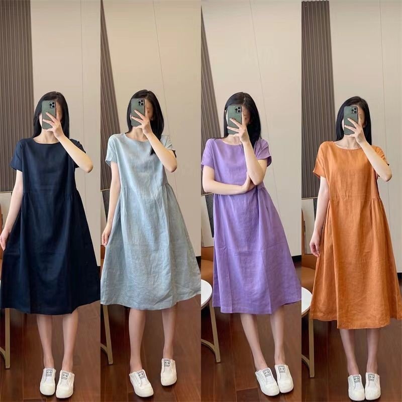 ✨Đầm Suông Cổ Tròn Tay Cộc Dáng Dài Chất Đũi Mềm Mại Nhiều Màu Lựa Chọn