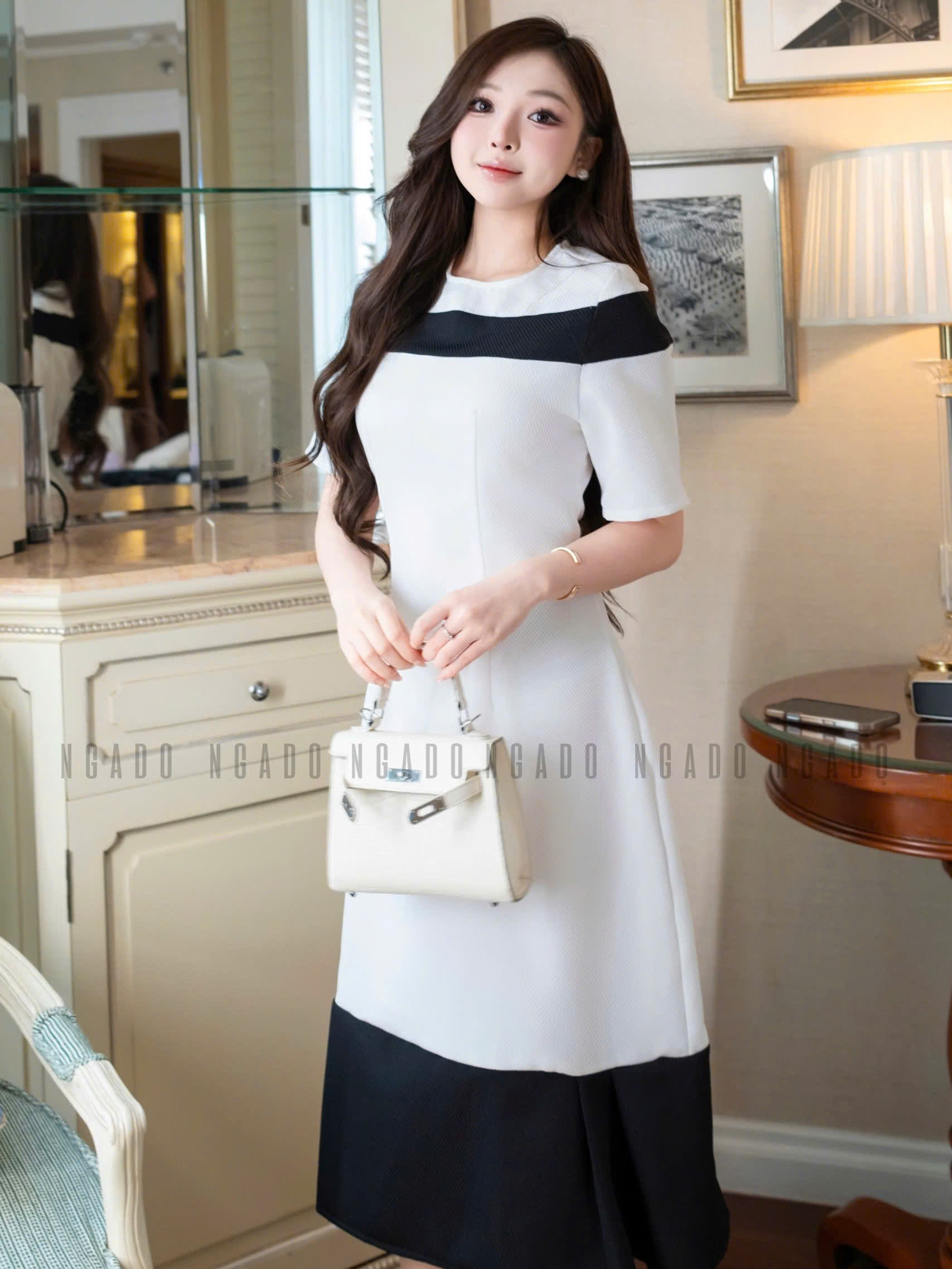 ✨Đầm trắng cổ tròn phối đen NGADO
