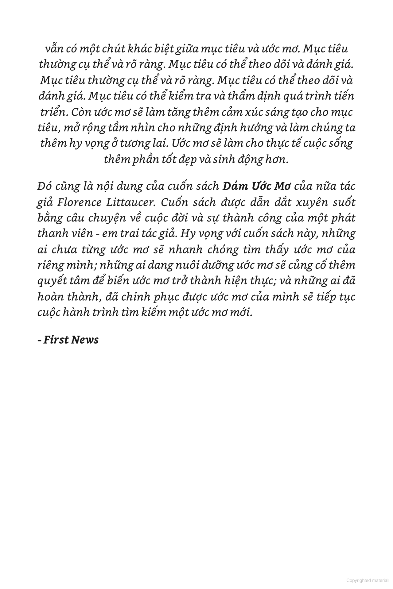 - Dám Ước Mơ – Florence Littauer Nội dung chính Florence Littauer truyền tải thông điệp: bạn sinh ra không phải để tầm thường. Qua những câu chuyện thực tế, bà khuyến khích bạn: