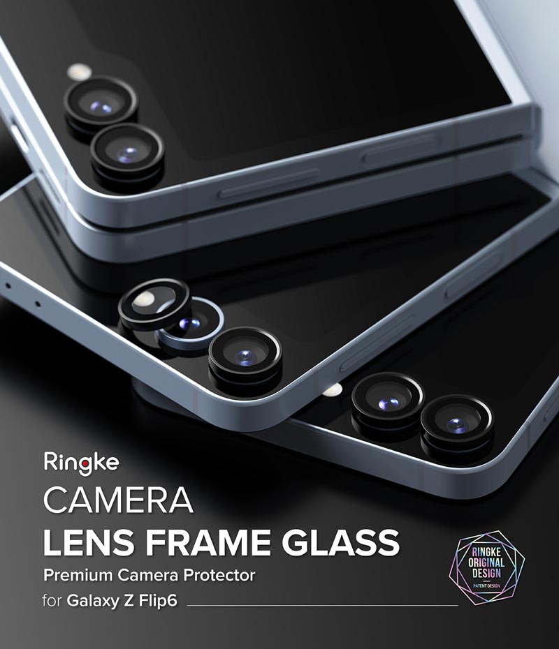 Dán camera Samsung Galaxy Z Flip 6 RINGKE Lens Frame Glass gồm 2 lens rời, chất liệu kính cường lực trong suốt với khung viền kim loại màu đen bảo vệ tối ưu cho camera,