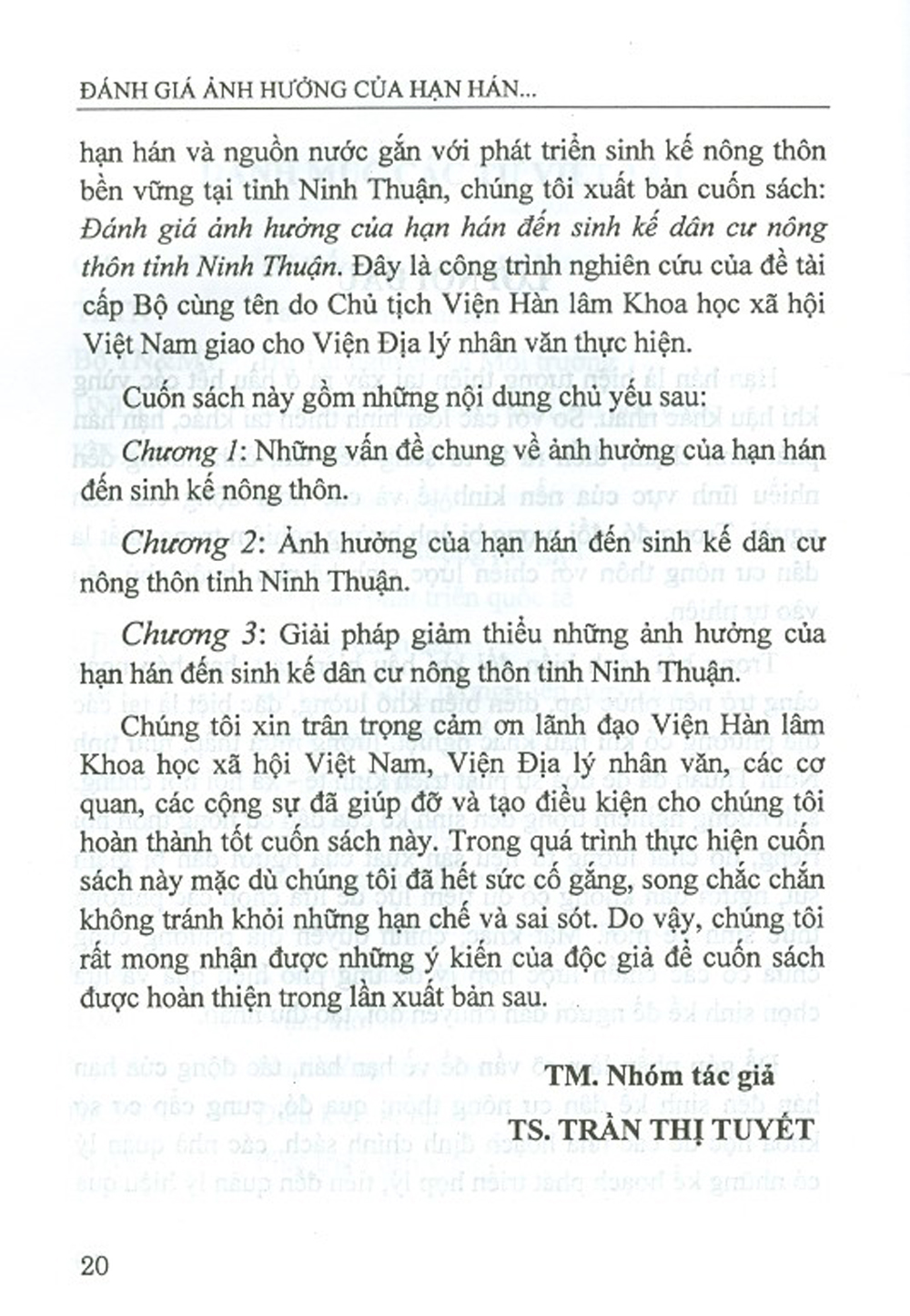 Vì vậy, để góp phần làm rõ vấn đề về hạn hán, tác động của hạn hán đến sinh kế dân cư nông thôn; qua đó cung cấp cơ sở khoa học để các nhà hoạch định chính sách, các nhà quản lý có những kế hoạch phát triển hợp lý tiến đến quản lý một cách hiệu quả hạn hán và nguồn nước gắn với phát triển kinh kế nông thôn bền vững tại tỉnh Ninh Thuận, tháng 12/2019 Nhà xuất bản Khoa học xã hội đã cho ra đời ấn phẩm Đánh giá ảnh hưởng của hạn hán đến sinh kế dân cư nông thôn tỉnh Ninh Thuận do TS. Trần Thị Tuyết, Viện Địa lý Nhân văn (thuộc Viện Hàn lâm Khoa học xã hội Việt Nam) chủ biên.