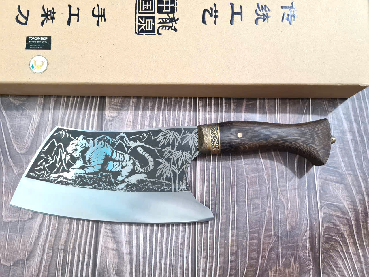 - Chức năng: Chặt xương ống, chân giò, trâu bò - Kích thước: Lưỡi: 22cm, cán: 10cm, rộng: 10cm, dầy: 5ly, trọng lượng: 800g - Cán : Gỗ mun, Khâu đồng đỏ , chốt đinh