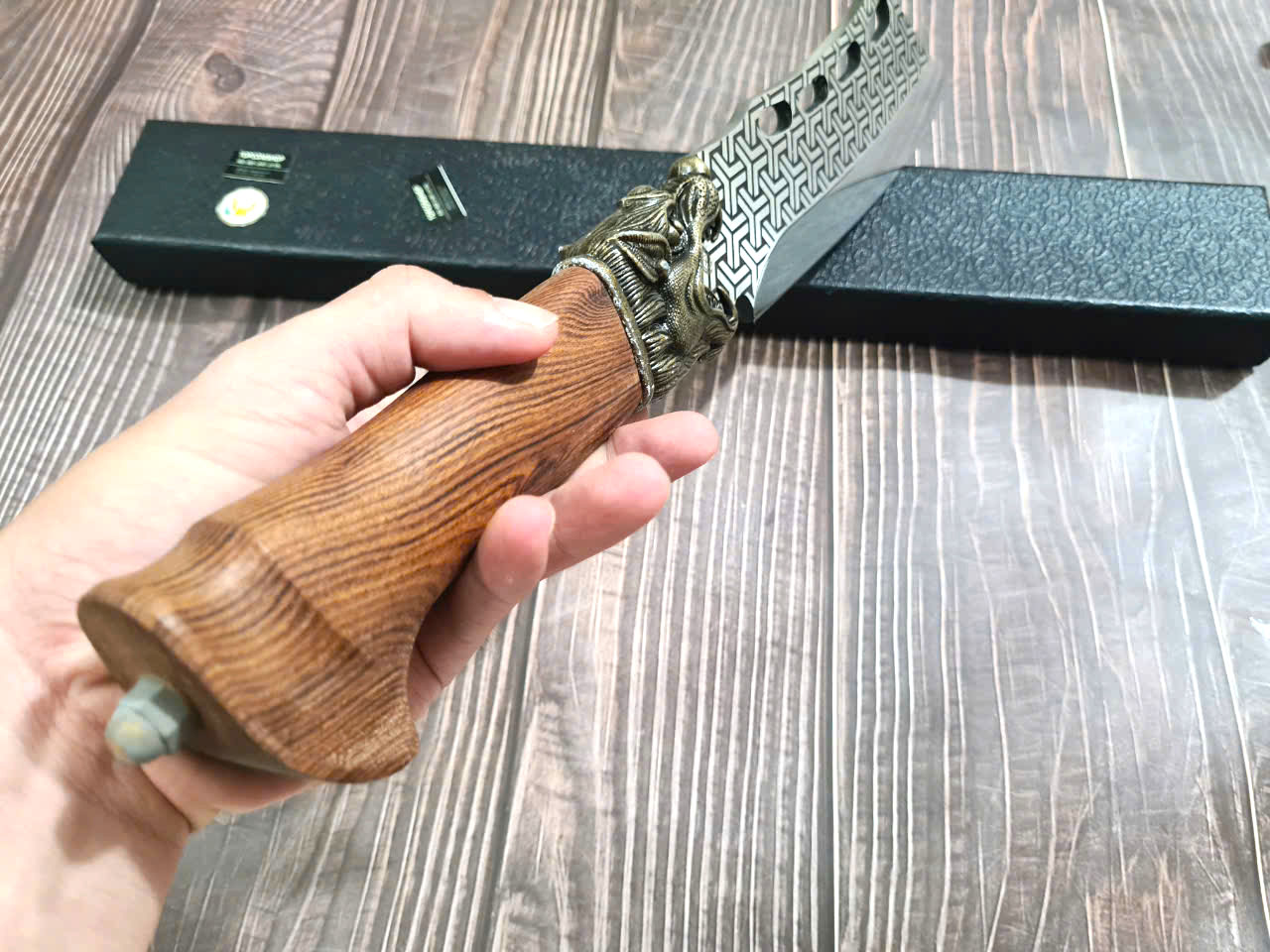 - DAO TR12 : Chiều dài TỔNG: 45cm Chiều dài lưỡi: 24.5cm Chiều rộng lưỡi: 7.5cm, Độ dày lưỡi: 6mm Trọng lượng: 1kg chất liệu lưỡi : 7Cr17MOV (thép 7 crom 17 molypden vanadi) Chất liệu tay cầm: gỗ cẩm lai, phụ kiện khâu đầu hổ và chuôi bằng đồng