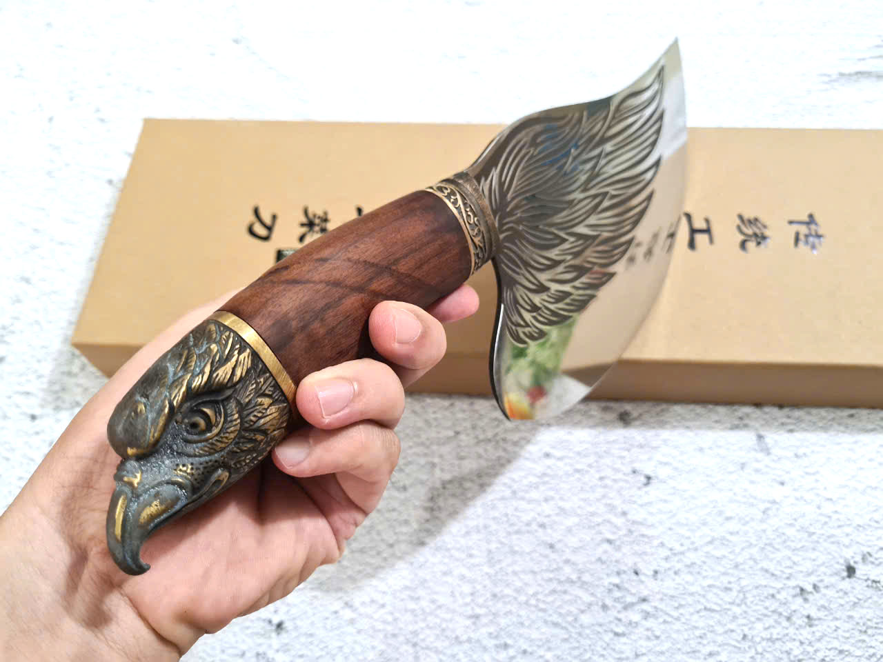 - Chức năng: Thái và Chặt gà vịt -Kích thước: Lưỡi: 20cm, cán: 12cm, rộng: 9cm, dầy: 2,5-3ly, trọng lượng: 450g - Cán : Gỗ cẩm chỉ , Khâu & chốt đồng đỏ. CÁCH BẢO