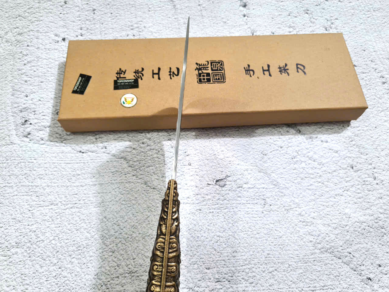 Chất liệu tay cầm: gỗ CẨM LAI, khâu và chuôi cuối dao bằng đồng thau