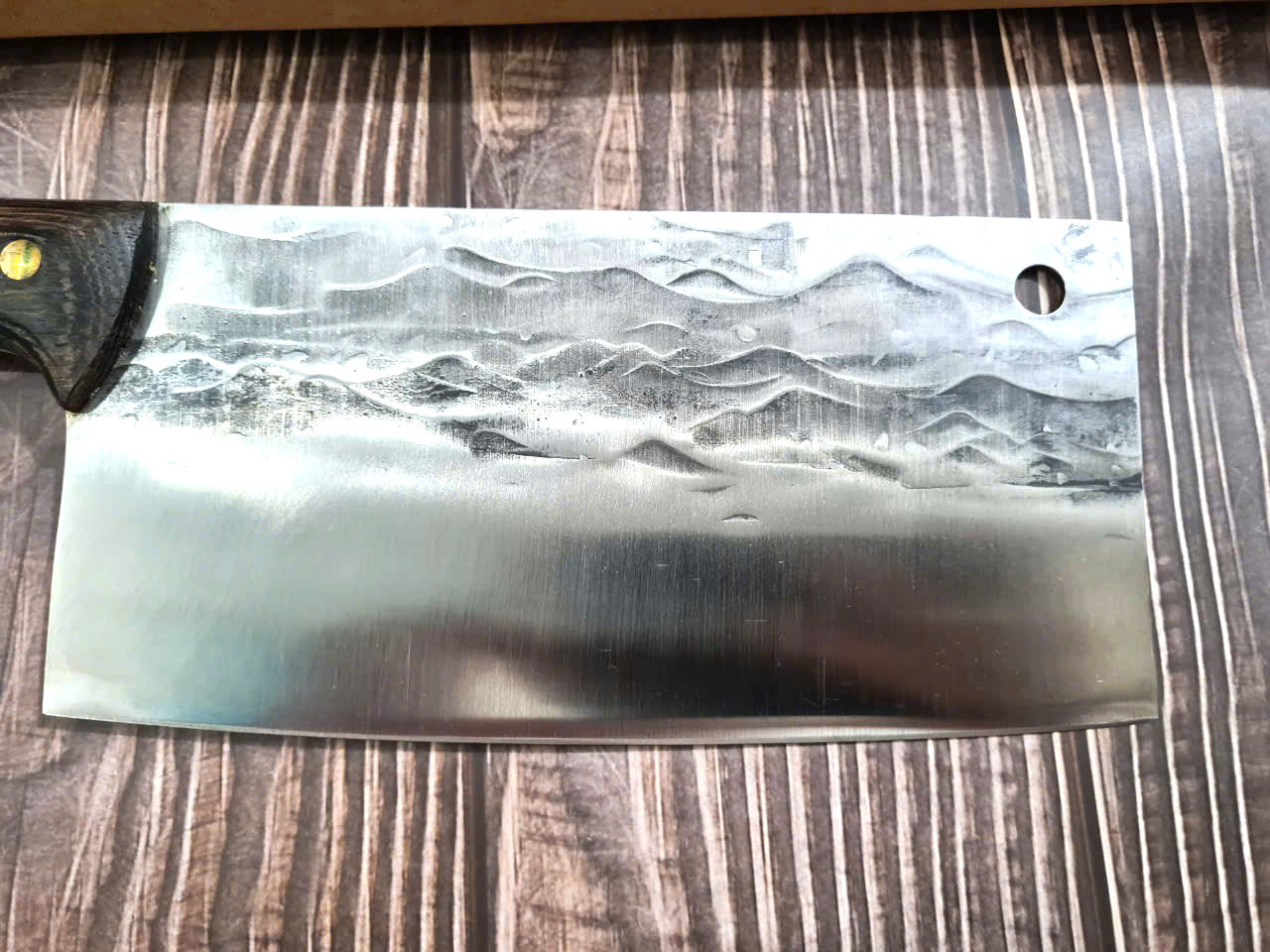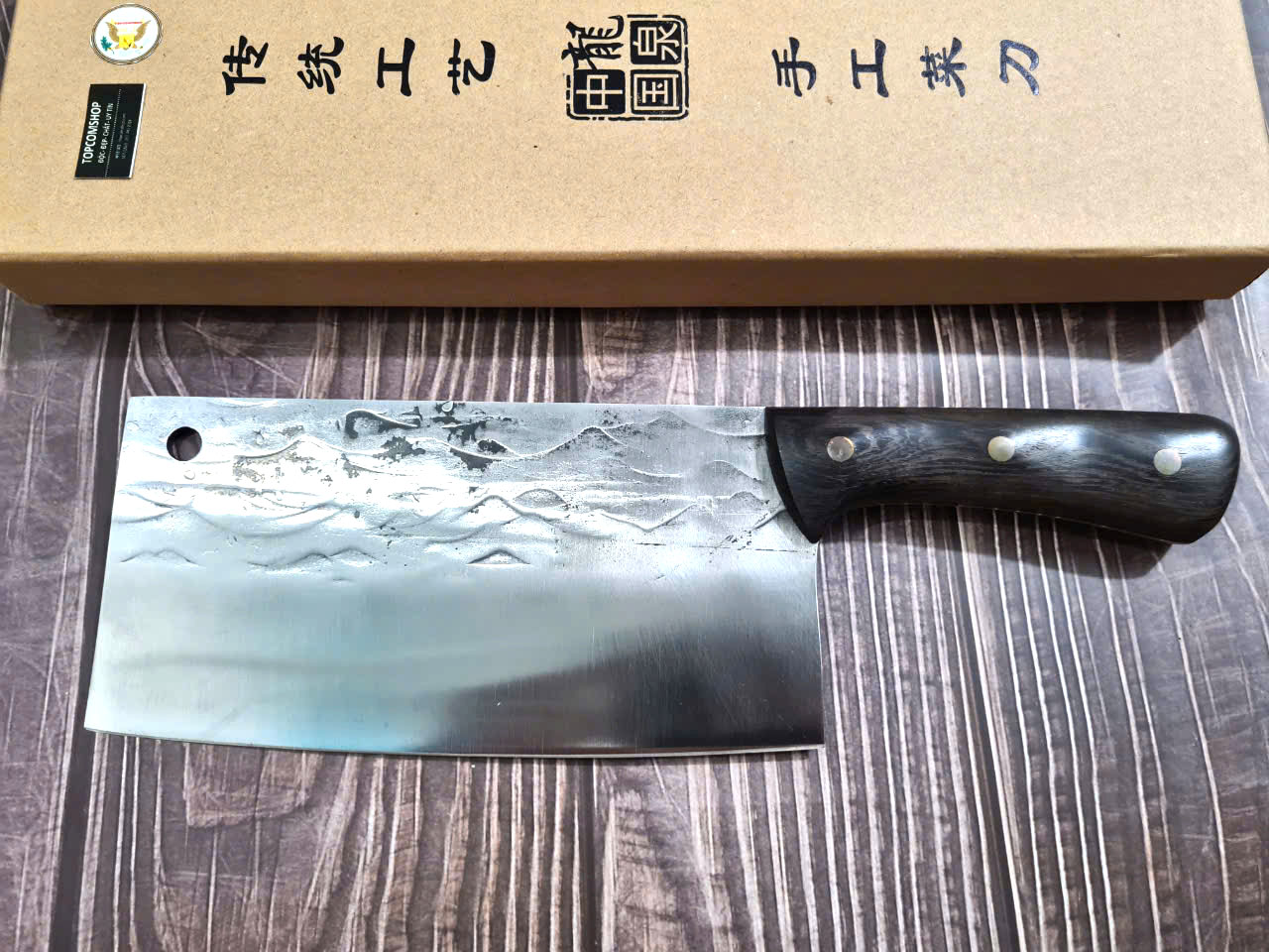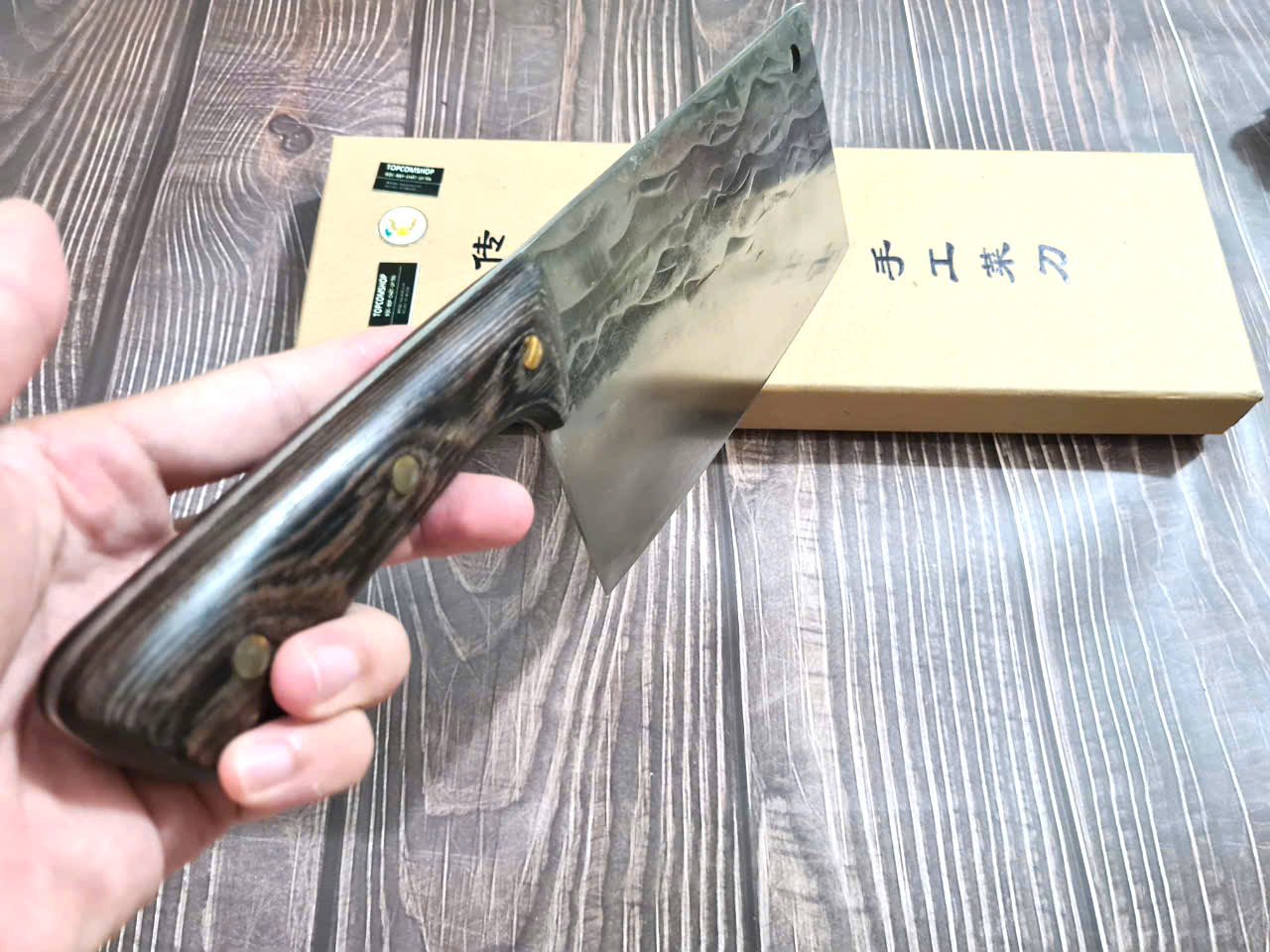 - Chức năng: Chặt xương ống, chân giò, trâu bò - Kích thước: Lưỡi: 22cm, cán: 10cm, rộng: 10cm, dầy: 5ly, trọng lượng: 800g - Cán : Gỗ mun, Khâu đồng đỏ , chốt đinh