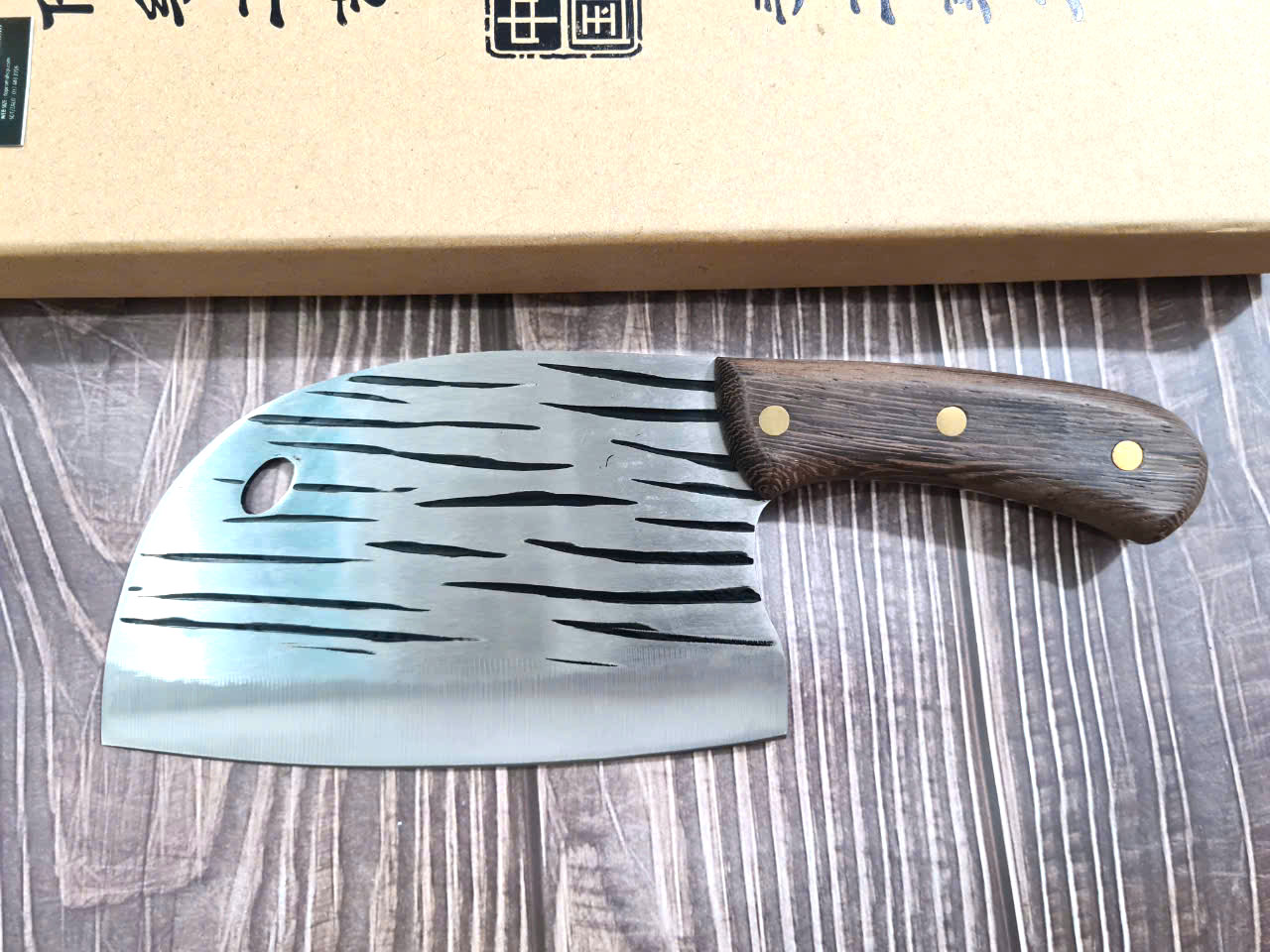 - Chức năng: Chặt xương ống, chân giò, trâu bò - Kích thước: Lưỡi: 22cm, cán: 10cm, rộng: 10cm, dầy: 5ly, trọng lượng: 800g - Cán : Gỗ mun, Khâu đồng đỏ , chốt đinh